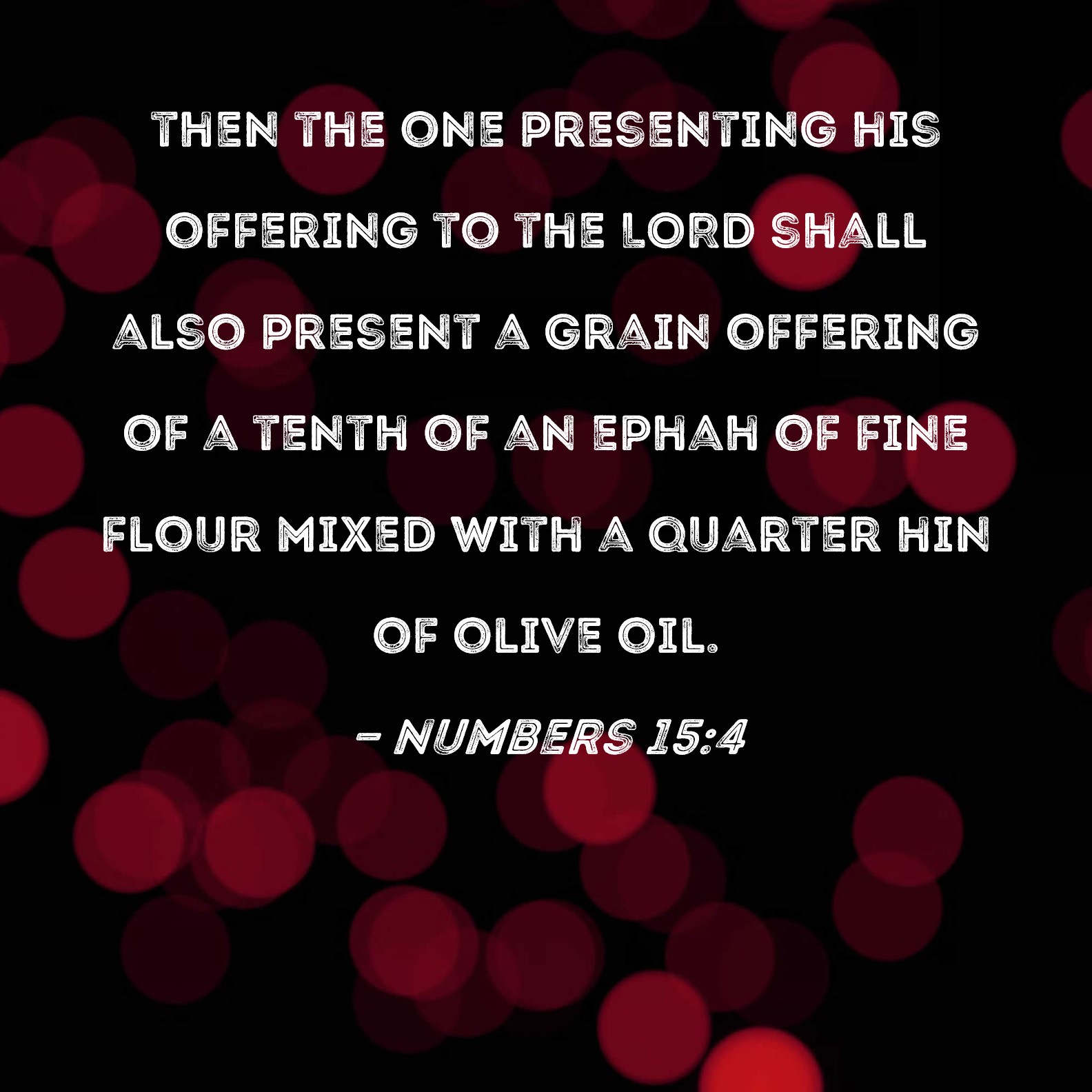Numbers 15:4 then the one presenting his offering to the LORD shall also present a grain offering of a tenth of an ephah of fine flour mixed with a quarter hin of olive oil.