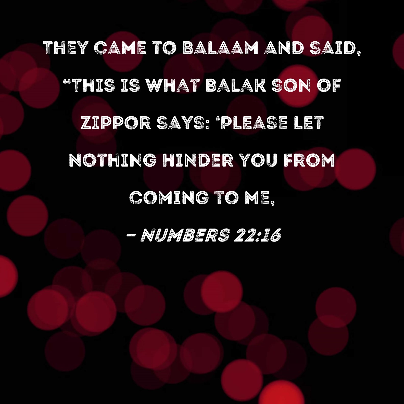 Numbers 22:16 They came to Balaam and said, "This is what Balak son of Zippor says: 'Please let nothing hinder you from coming to me,