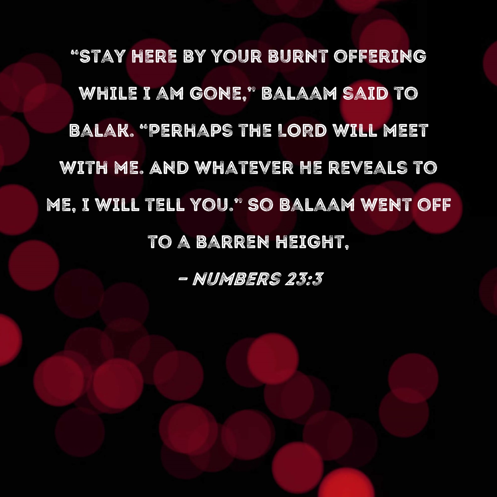 Numbers 23:3 "Stay here by your burnt offering while I am gone," Balaam said to Balak. "Perhaps the LORD will meet with me. And whatever He reveals to me, I will tell you." So Balaam went off to a barren height,
