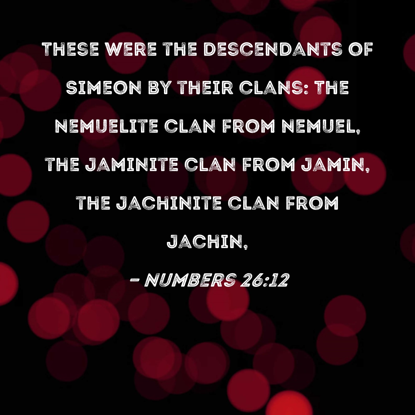 Numbers 26:12 These were the descendants of Simeon by their clans: The Nemuelite clan from Nemuel, the Jaminite clan from Jamin, the Jachinite clan from Jachin,
