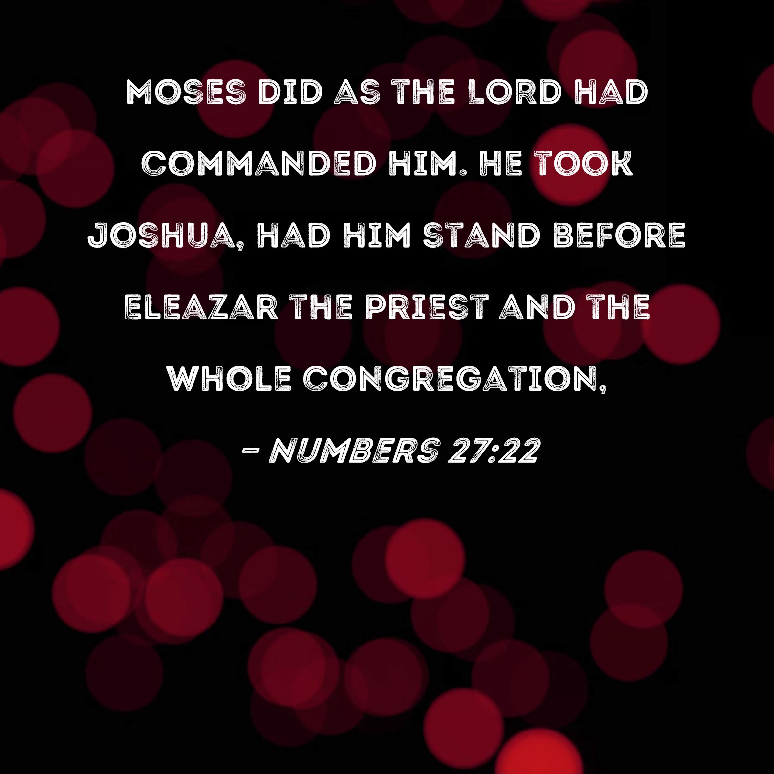 Numbers 27:22 Moses did as the LORD had commanded him. He took Joshua, had him stand before Eleazar the priest and the whole congregation,