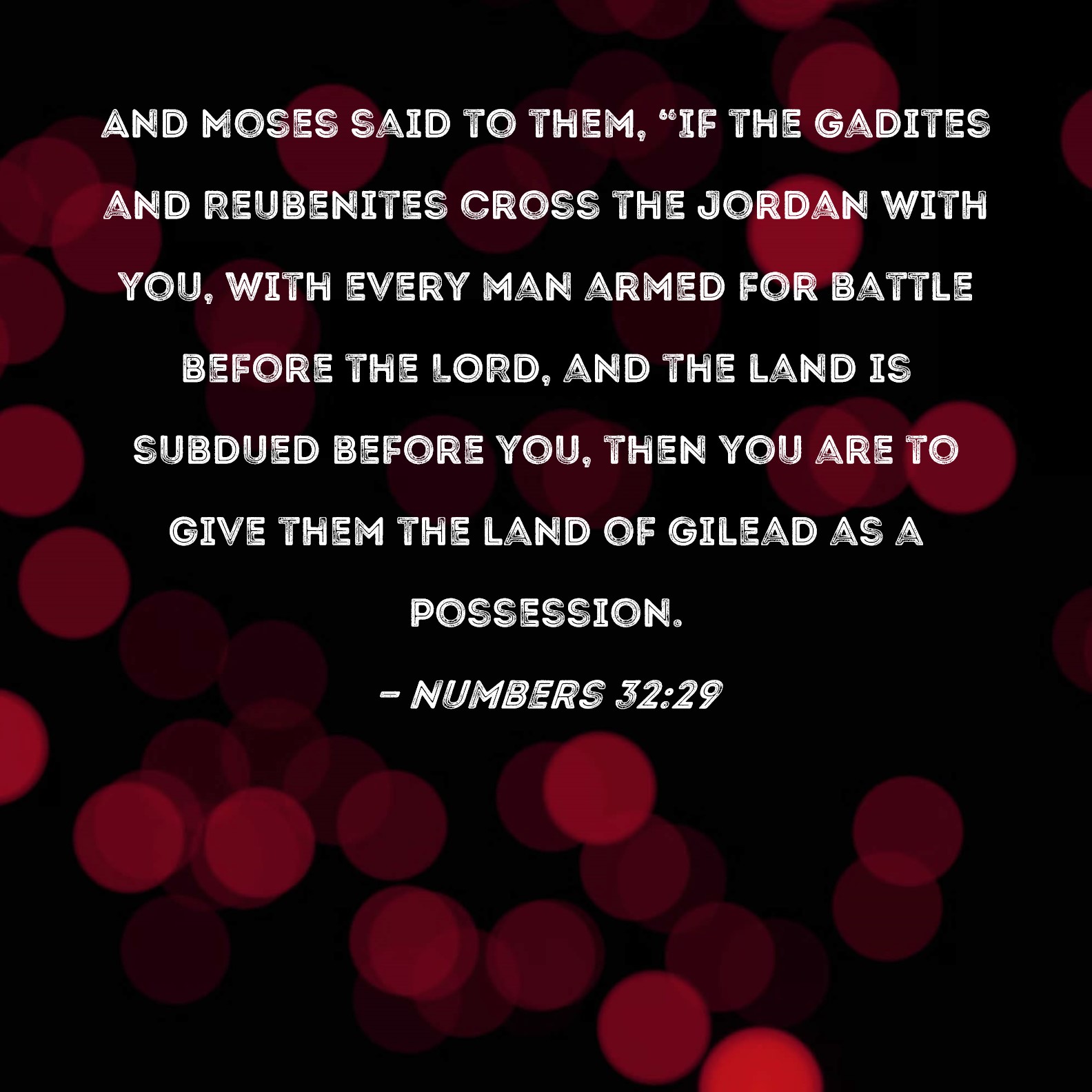 Numbers 32:29 And Moses said to them, "If the Gadites and Reubenites cross the Jordan with you, with every man armed for battle before the LORD, and the land is subdued before you, then you are to give them the land of Gilead as a possession.