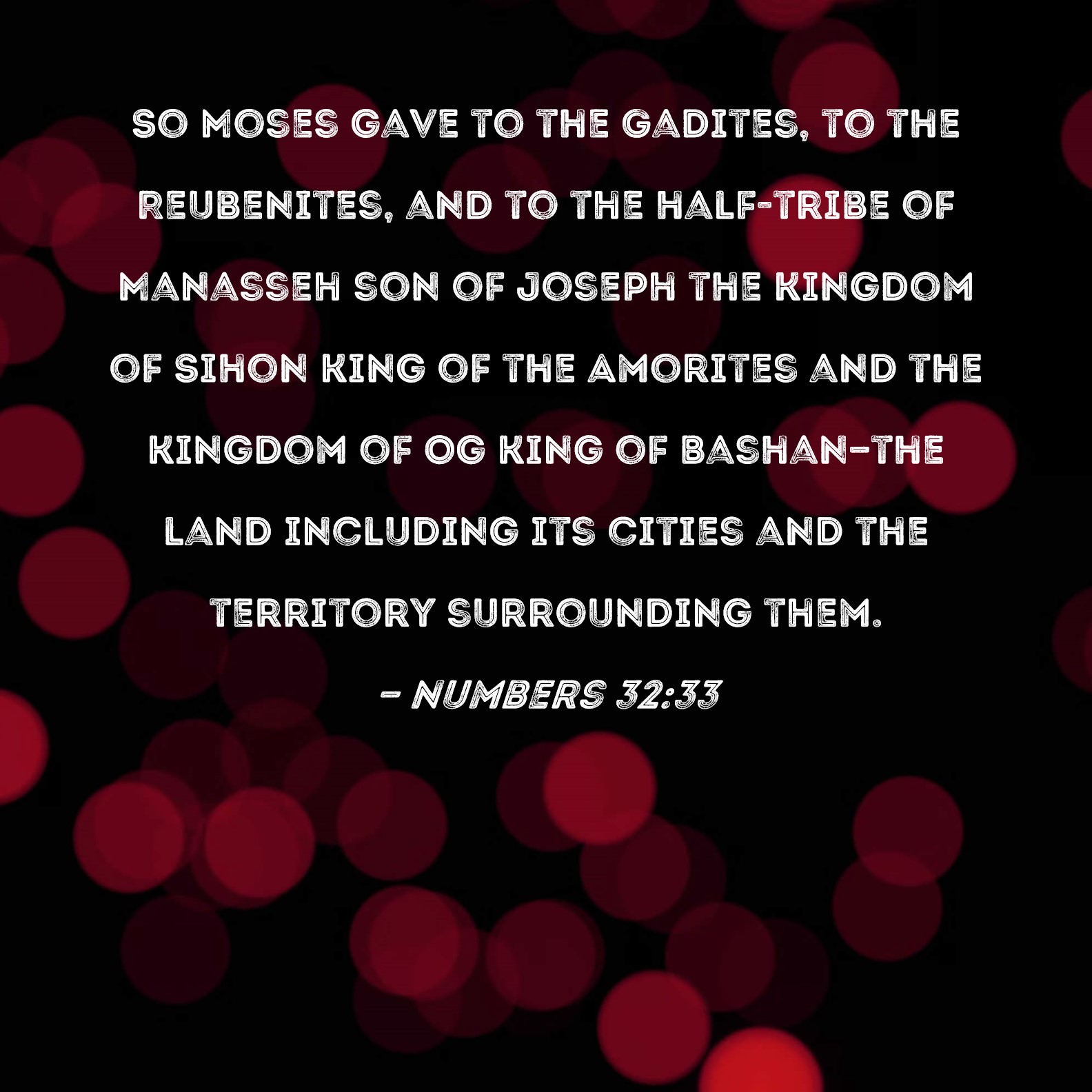 Numbers 32:33 So Moses gave to the Gadites, to the Reubenites, and to the half-tribe of Manasseh son of Joseph the kingdom of Sihon king of the Amorites and the kingdom of Og king of Bashan--the land including its cities and the territory surrounding them.