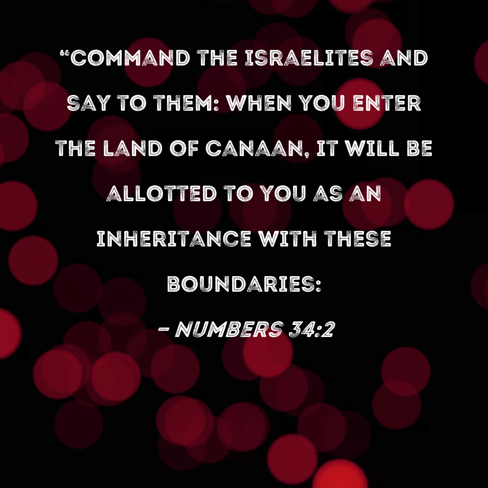 Numbers 34:2 "Command the Israelites and say to them: When you enter the land of Canaan, it will be allotted to you as an inheritance with these boundaries: