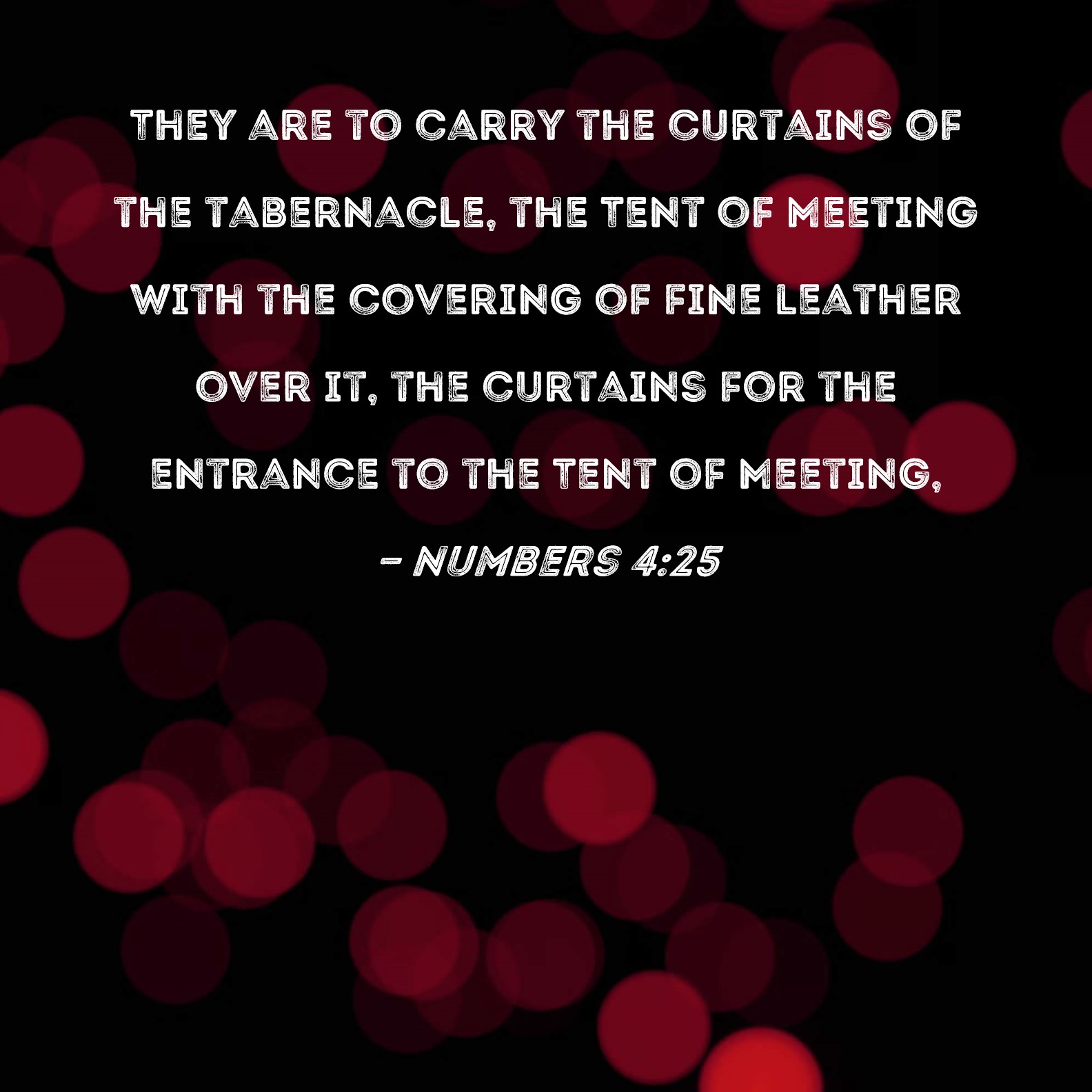Numbers 4:25 They are to carry the curtains of the tabernacle, the Tent of Meeting with the covering of fine leather over it, the curtains for the entrance to the Tent of Meeting,