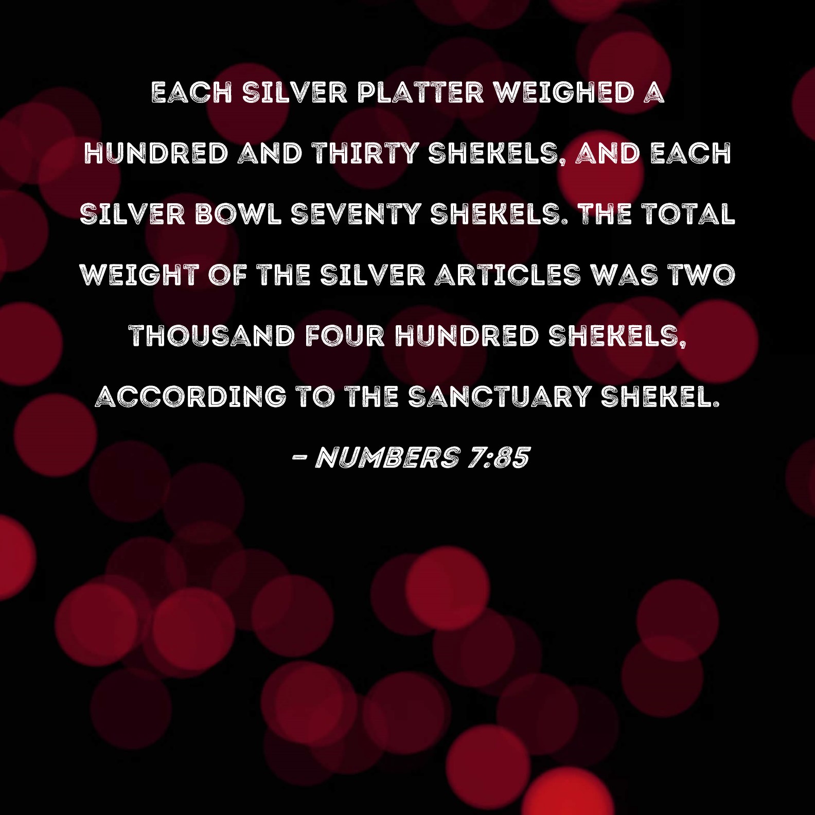 Numbers 7:85 Each silver platter weighed a hundred and thirty shekels, and each silver bowl seventy shekels. The total weight of the silver articles was two thousand four hundred shekels, according to the sanctuary shekel.