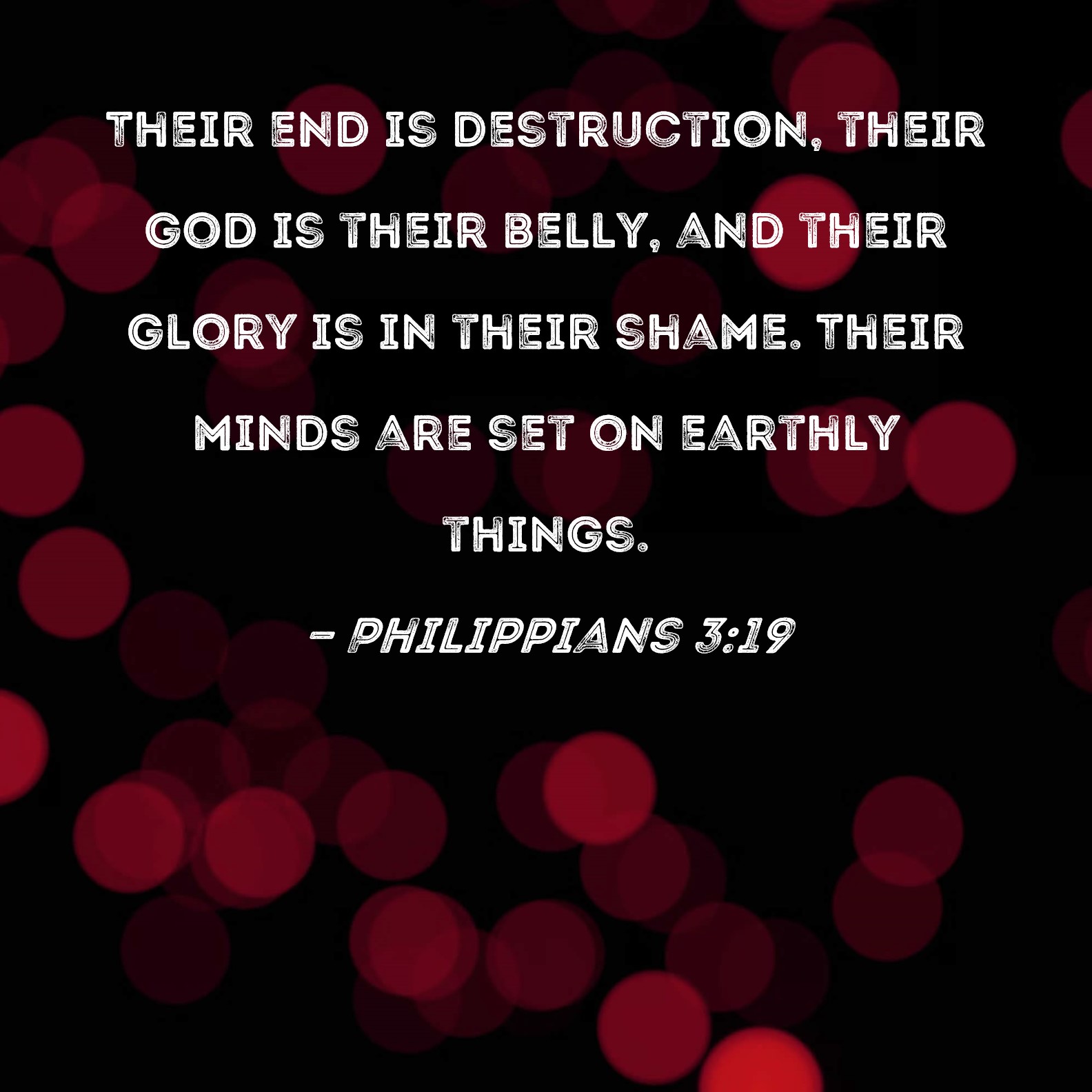 Philippians 3:19 Their end is destruction, their god is their belly, and their glory is in their shame. Their minds are set on earthly things.