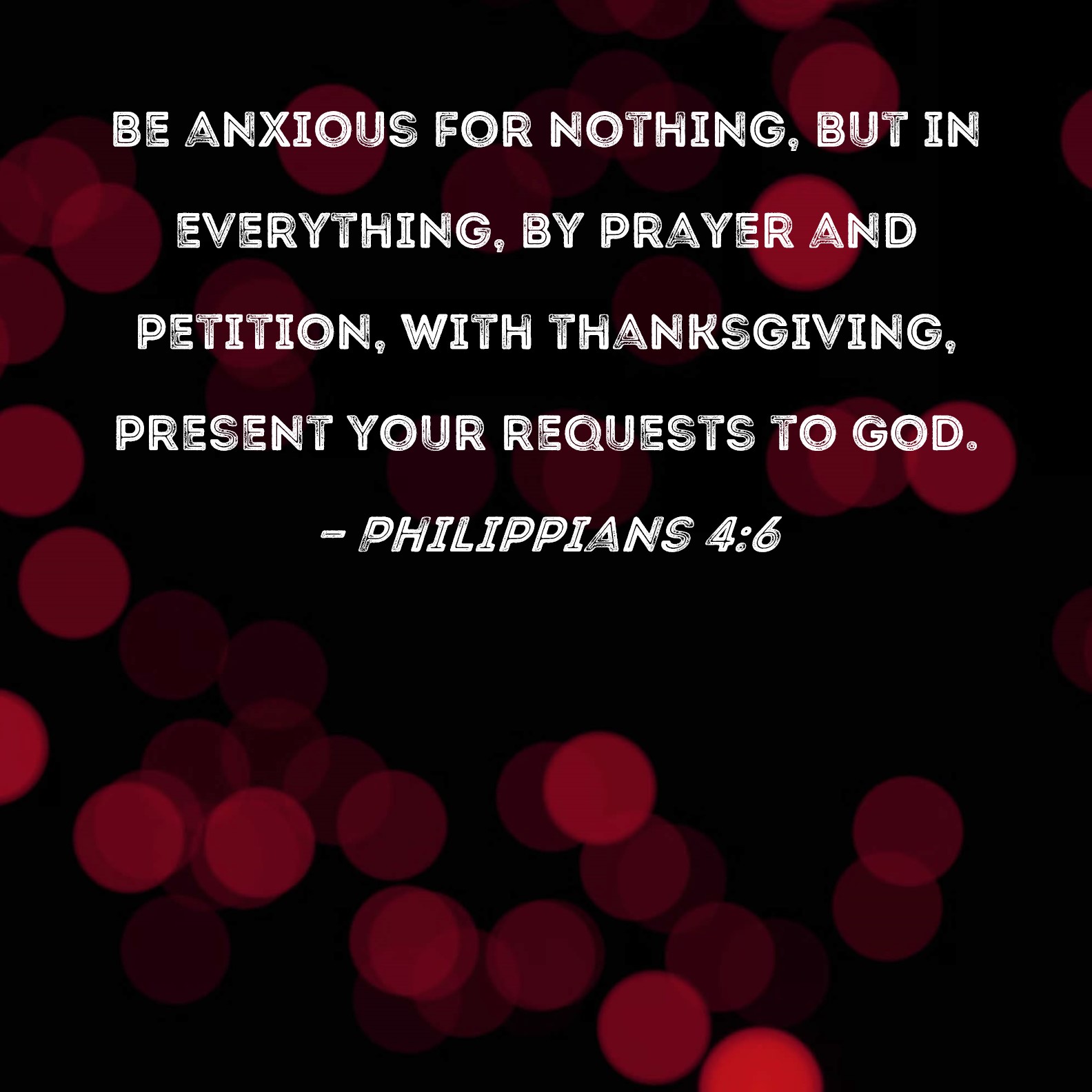 BSB: Be anxious for nothing, but in everything, by prayer and petition, with thanksgiving, present your requests to God. KJV: Be careful for nothing; but in every thing by prayer and supplication with thanksgiving let your requests be made known unto God. DRB: Be nothing solicitous; but in every thing, by prayer and supplication, with thanksgiving, let your petitions be made known to God. DBT: Be careful about nothing; but in everything, by prayer and supplication with thanksgiving, let your requests be made known to God; ERV: In nothing be anxious; but in everything by prayer and supplication with thanksgiving let your requests be made known unto God. WBT: Be anxious for nothing; but in every thing by prayer and supplication with thanksgiving let your requests be made known to God. WEB: In nothing be anxious, but in everything, by prayer and petition with thanksgiving, let your requests be made known to God. YLT: for nothing be anxious, but in everything by prayer, and by supplication, with thanksgiving, let your requests be made known unto God;Links Philippians 4:6 NIV • Philippians 4:6 NLT • Philippians 4:6 ESV • Philippians 4:6 NASB • Philippians 4:6 KJV • Philippians 4:6 Interlinear • Philippians 4:6 Commentaries • Philippians 4:6 Parallel Texts • Philippians 4:6 Bible Apps • Philippians 4:6 Parallel • Bible Hub |