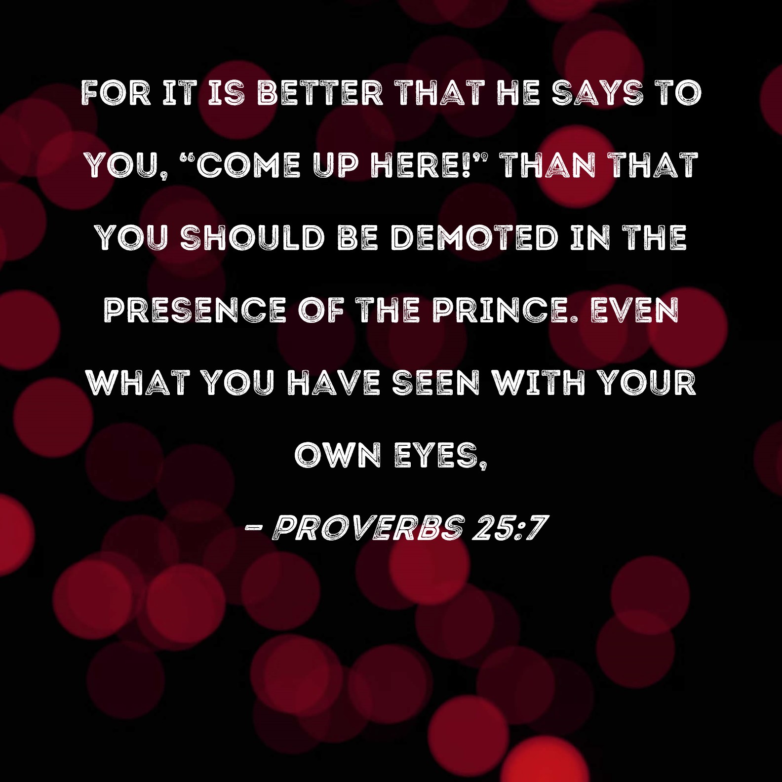 Proverbs 25:7 for it is better that he says to you, "Come up here!" than that you should be demoted in the presence of the prince. Even what you have seen with your own eyes,