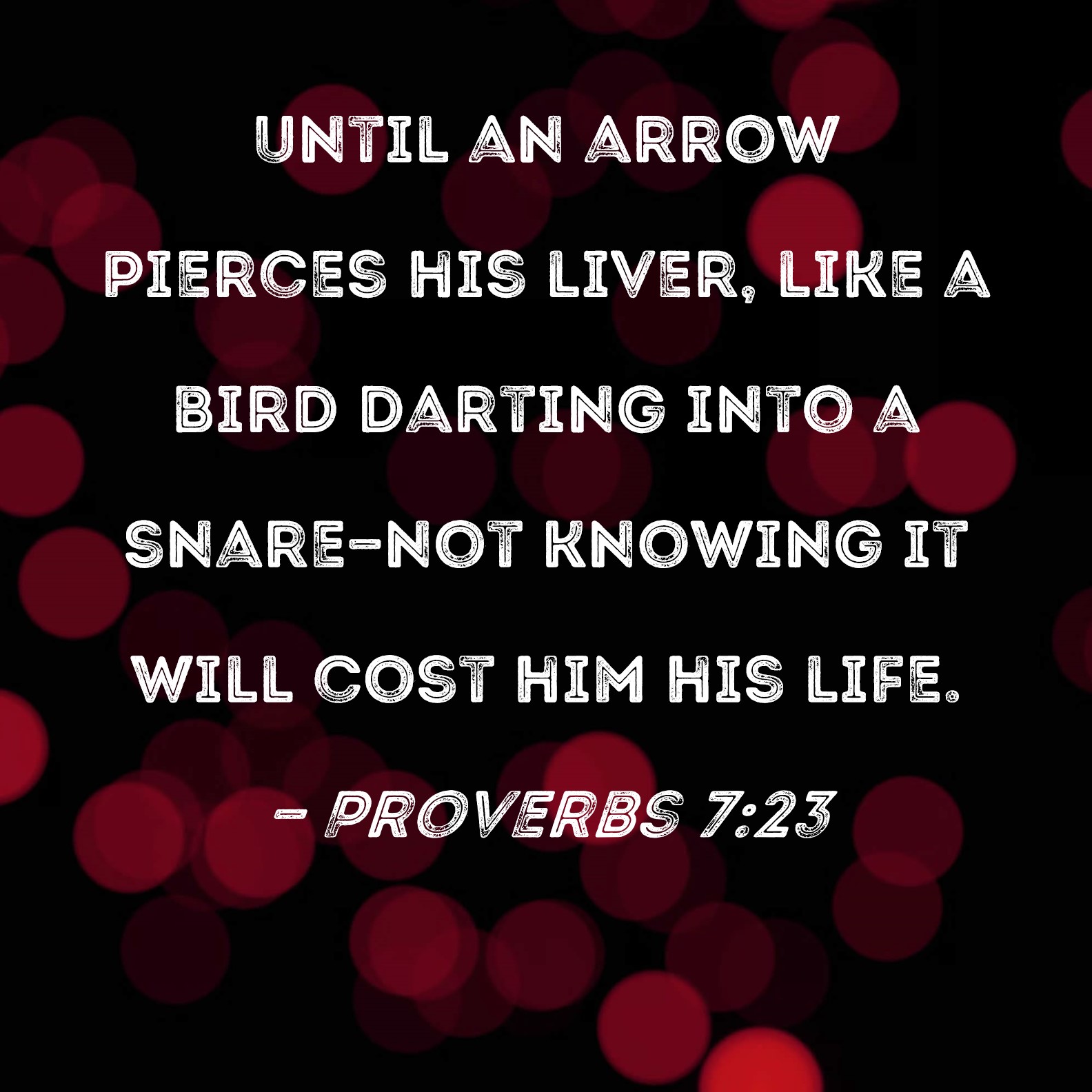 Proverbs 7:23 until an arrow pierces his liver, like a bird darting into a snare--not knowing it will cost him his life.