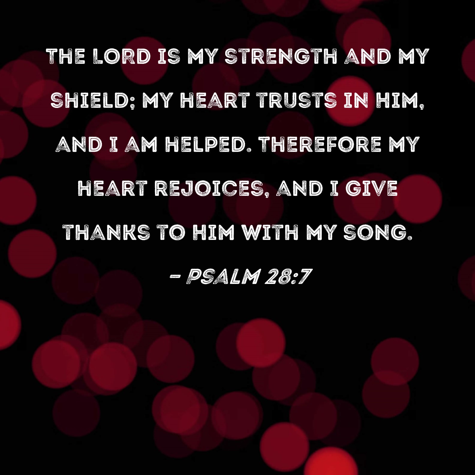 Psalm 28:7 The LORD is my strength and my shield; my heart trusts in Him, and I am helped. Therefore my heart rejoices, and I give thanks to Him with my song.