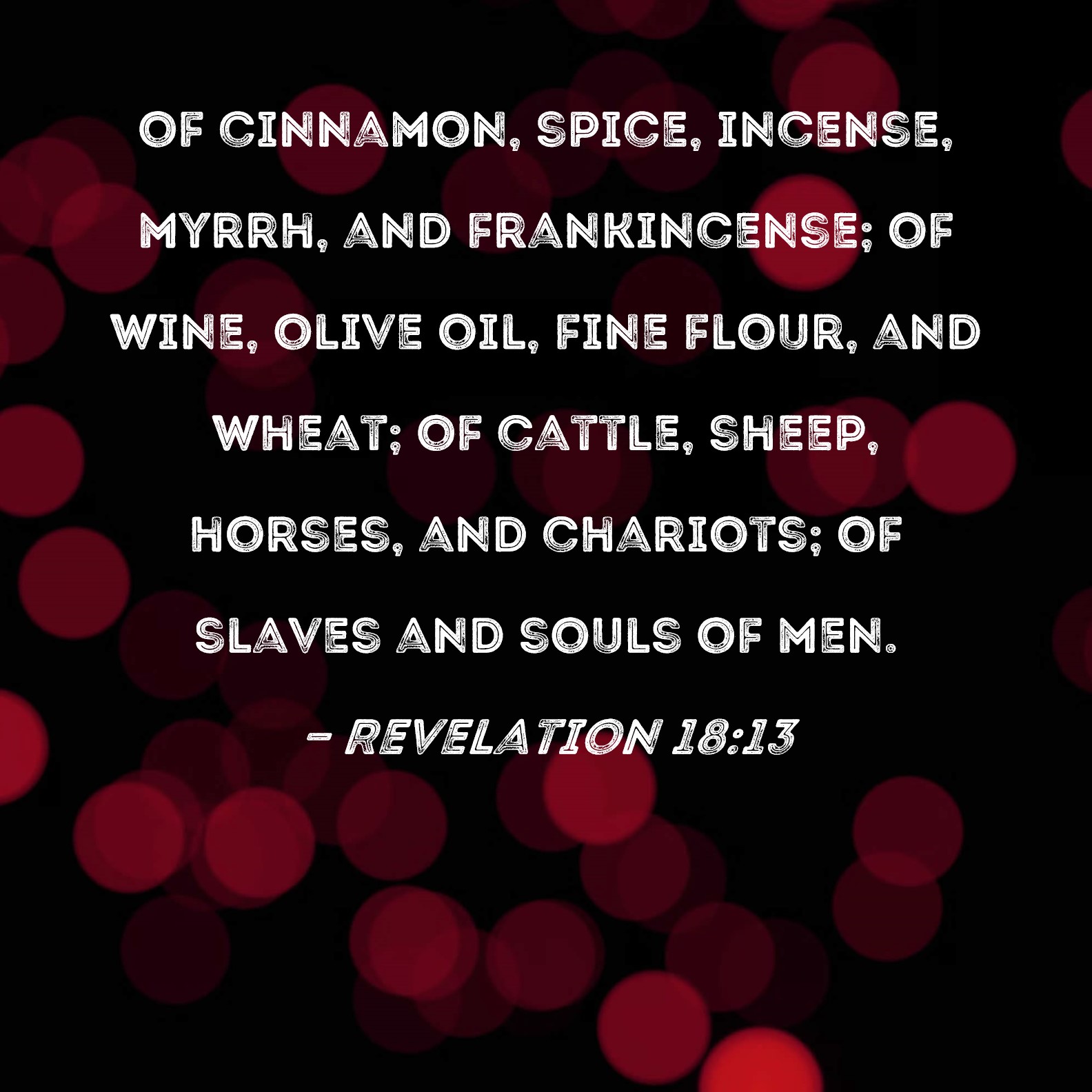 Revelation 18:13 of cinnamon, spice, incense, myrrh, and frankincense; of wine, olive oil, fine flour, and wheat; of cattle, sheep, horses, and chariots; of slaves and souls of men.
