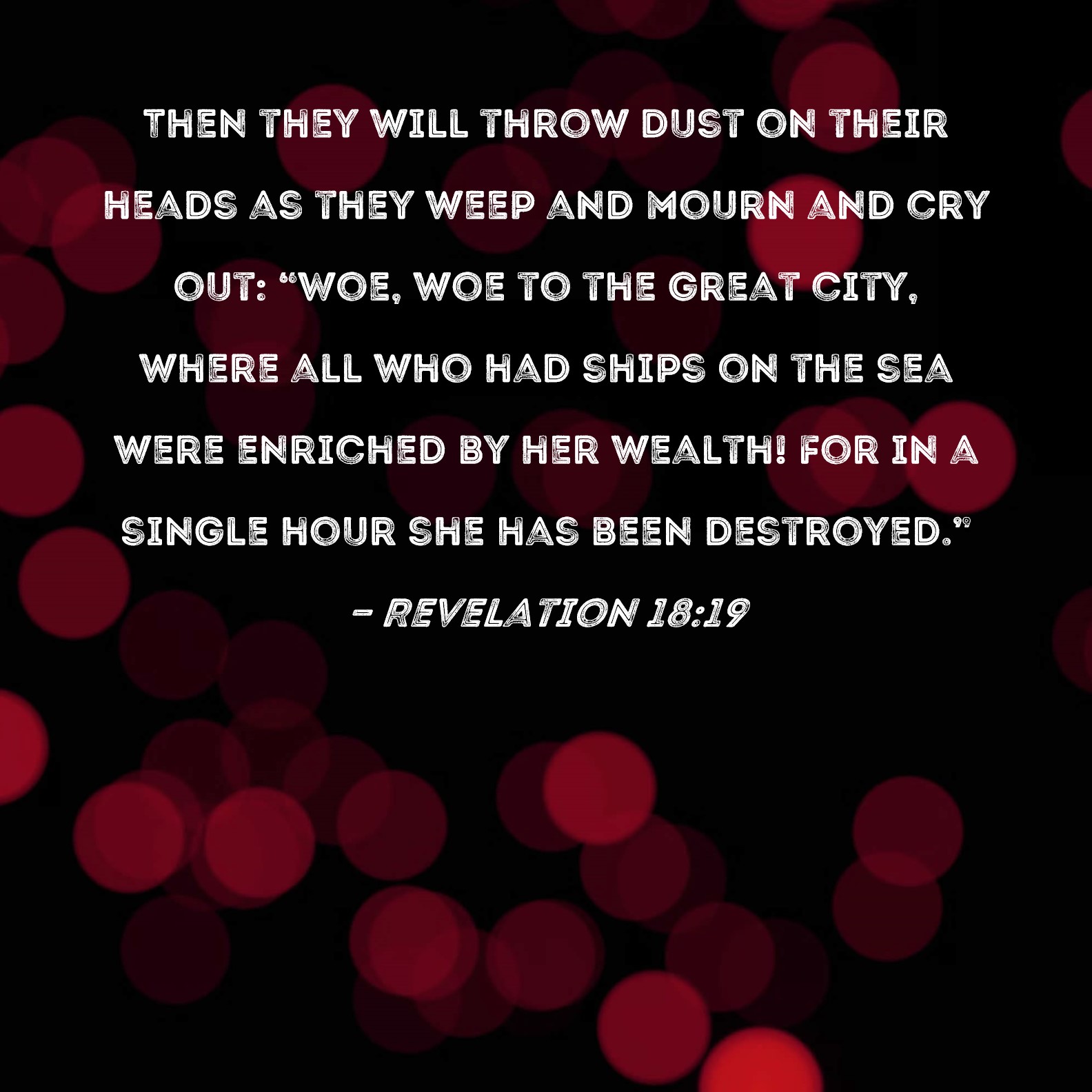 Revelation 18:19 Then they will throw dust on their heads as they weep and mourn and cry out: "Woe, woe to the great city, where all who had ships on the sea were enriched by her wealth! For in a single hour she has been destroyed."