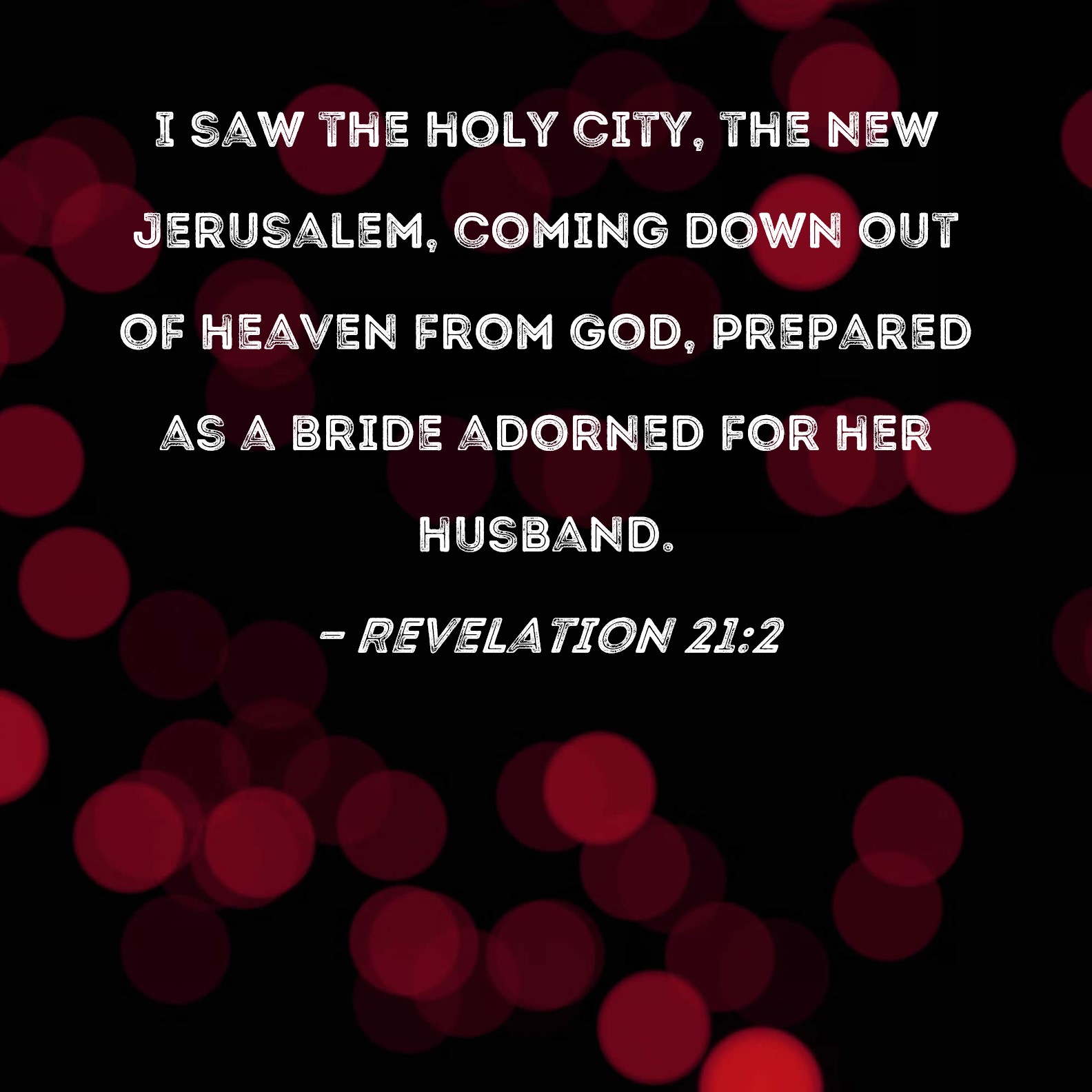 Revelation 21:2 I saw the holy city, the new Jerusalem, coming down out of heaven from God, prepared as a bride adorned for her husband.