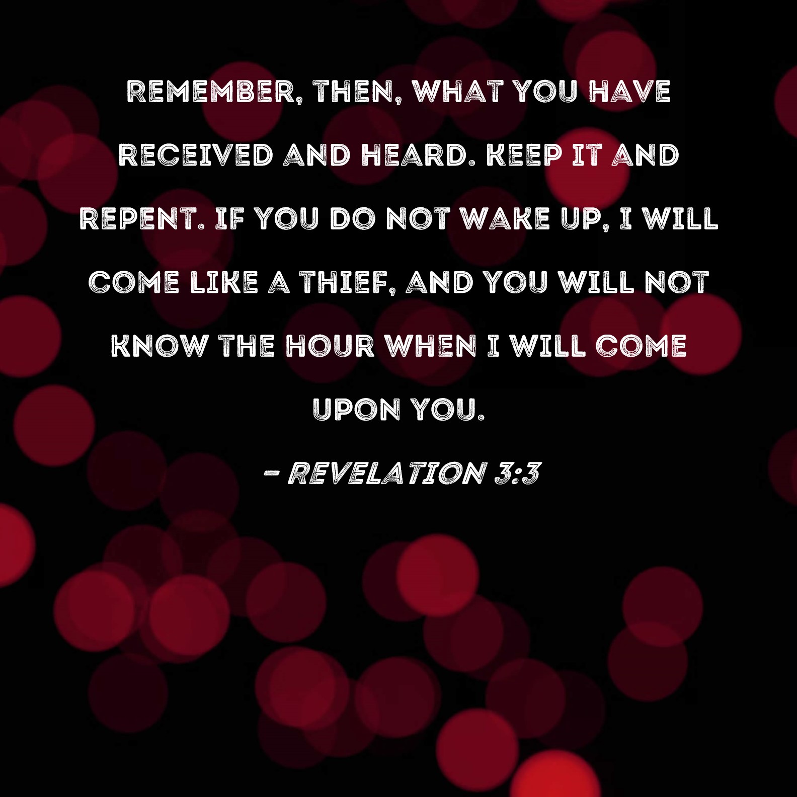 Revelation 3:3 Remember, then, what you have received and heard. Keep it and repent. If you do not wake up, I will come like a thief, and you will not know the hour when I will come upon you.
