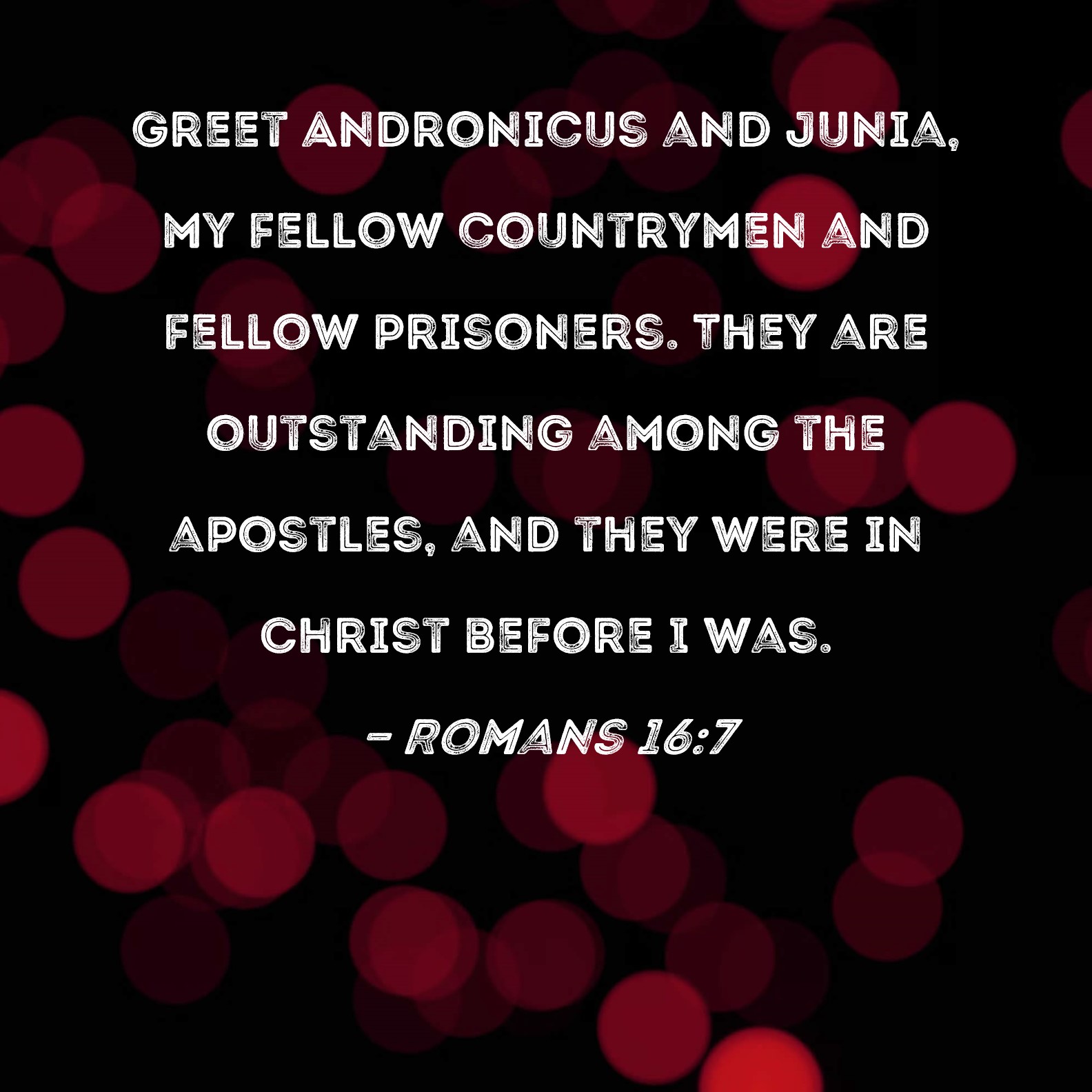 Romans 16:7 Greet Andronicus and Junia, my fellow countrymen and fellow prisoners. They are outstanding among the apostles, and they were in Christ before I was.