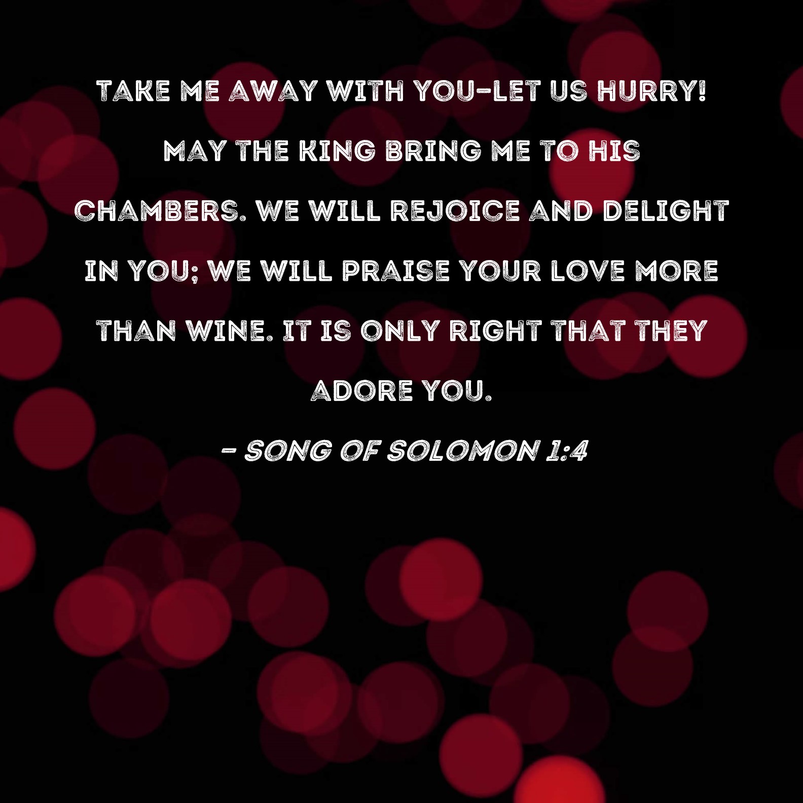 Song of Solomon 1:4 Take me away with you--let us hurry! May the king bring me to his chambers. We will rejoice and delight in you; we will praise your love more than wine. It is only right that they adore you.