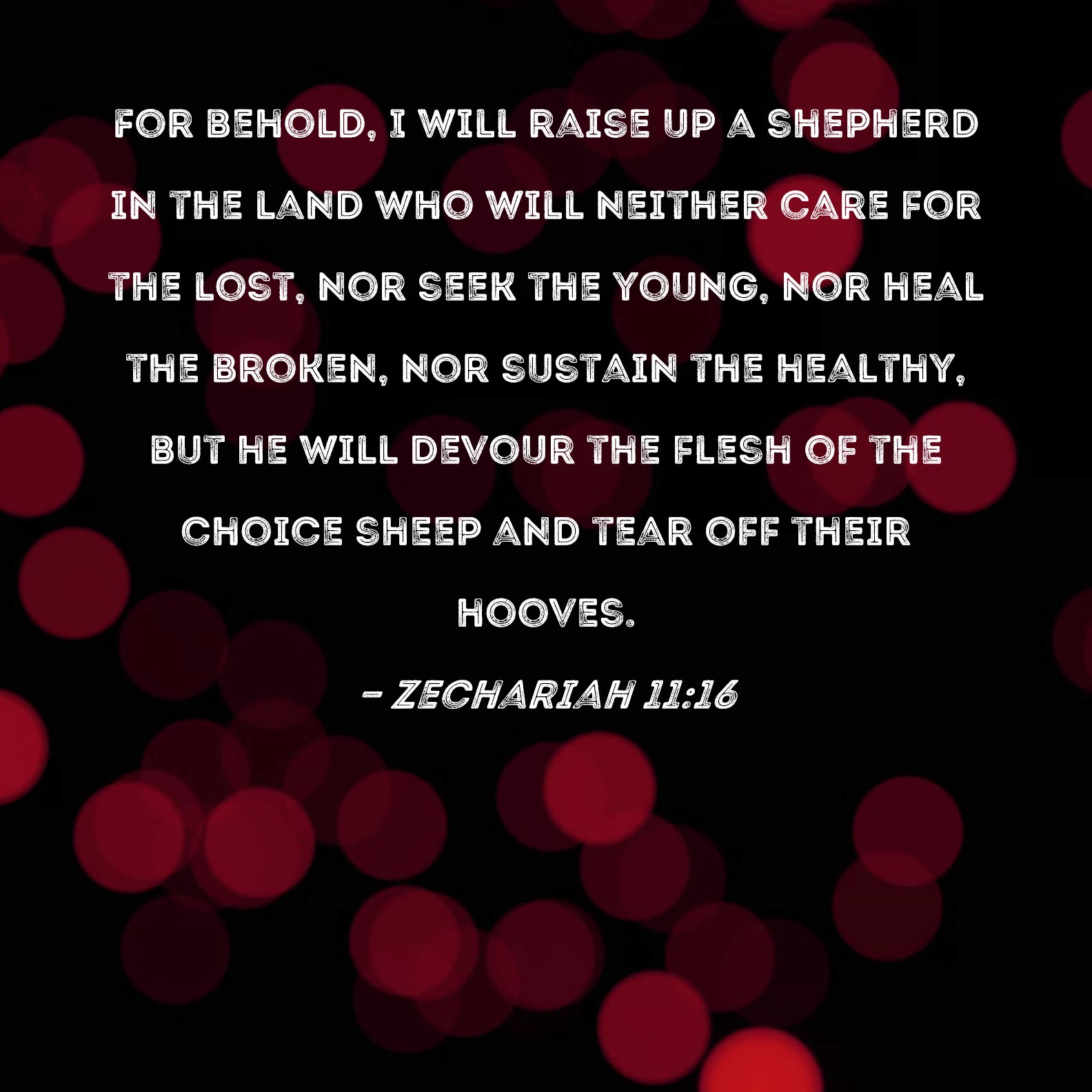 Zechariah 11:16 For behold, I will raise up a shepherd in the land who will neither care for the lost, nor seek the young, nor heal the broken, nor sustain the healthy, but he will devour the flesh of the choice sheep and tear off their hooves.