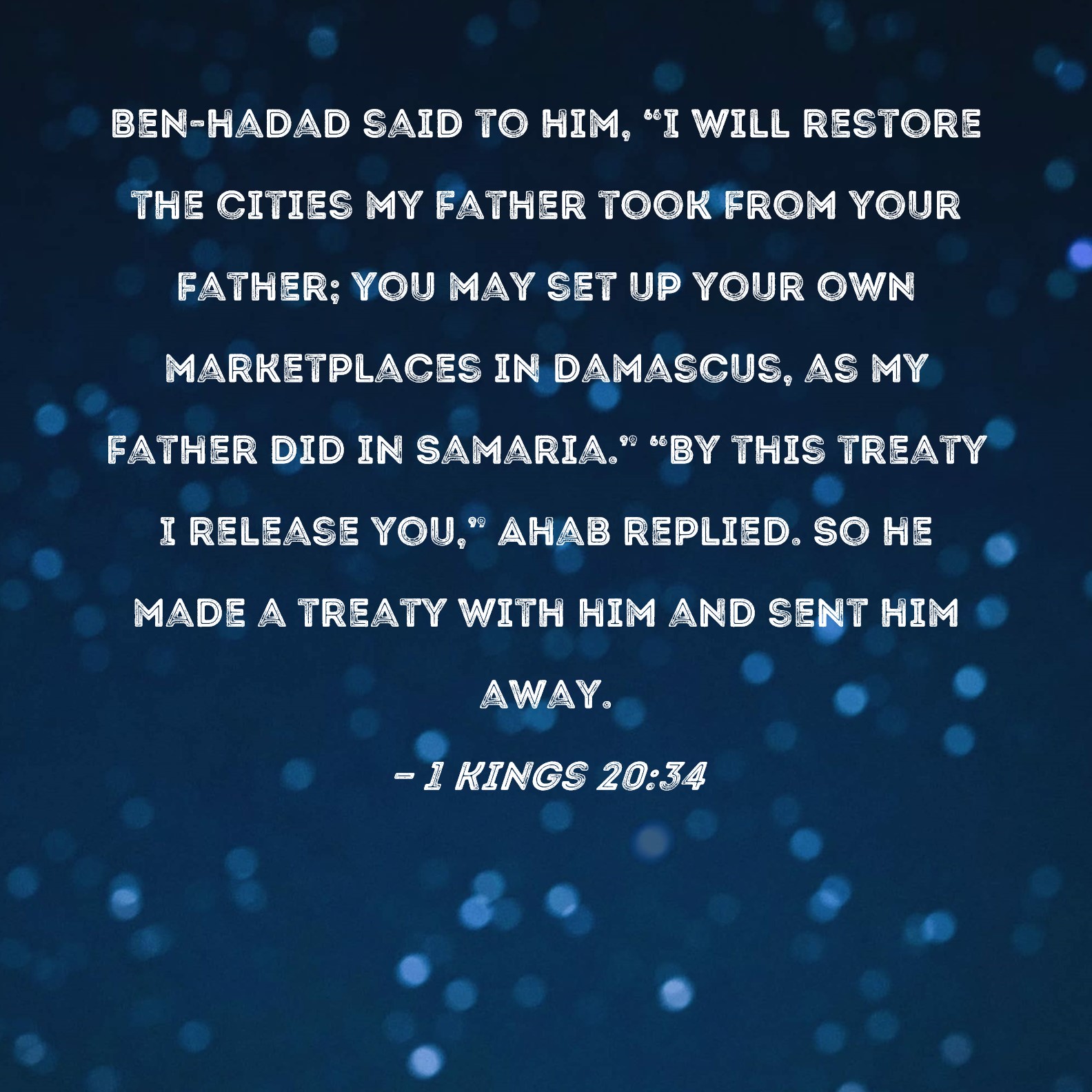 1 Kings 20:34 Ben-hadad said to him, "I will restore the cities my father took from your father; you may set up your own marketplaces in Damascus, as my father did in Samaria." "By this treaty I release you," Ahab replied. So he made a treaty with him and sent him away.