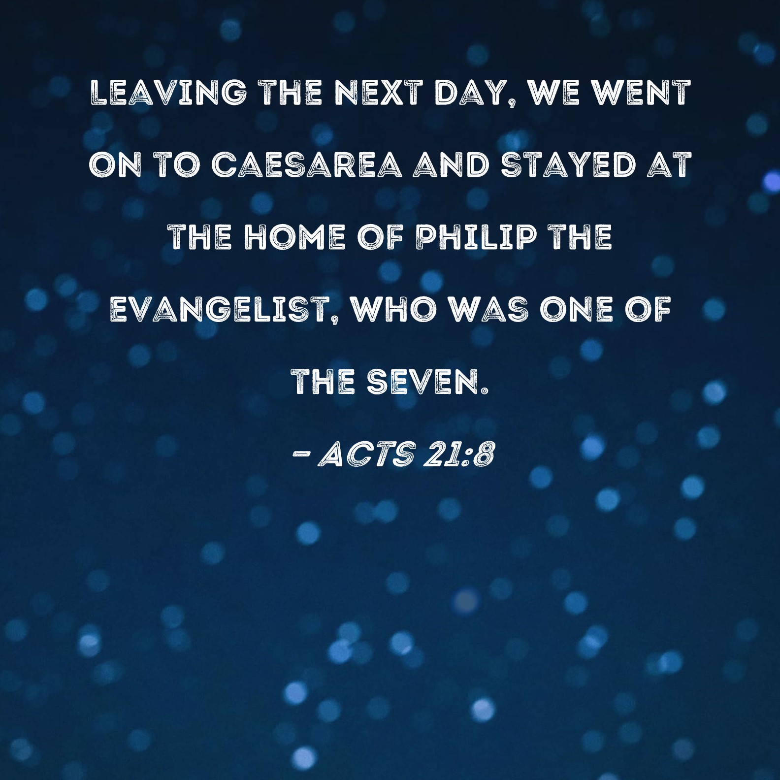 Acts 21:8 Leaving the next day, we went on to Caesarea and stayed at the home of Philip the evangelist, who was one of the Seven.