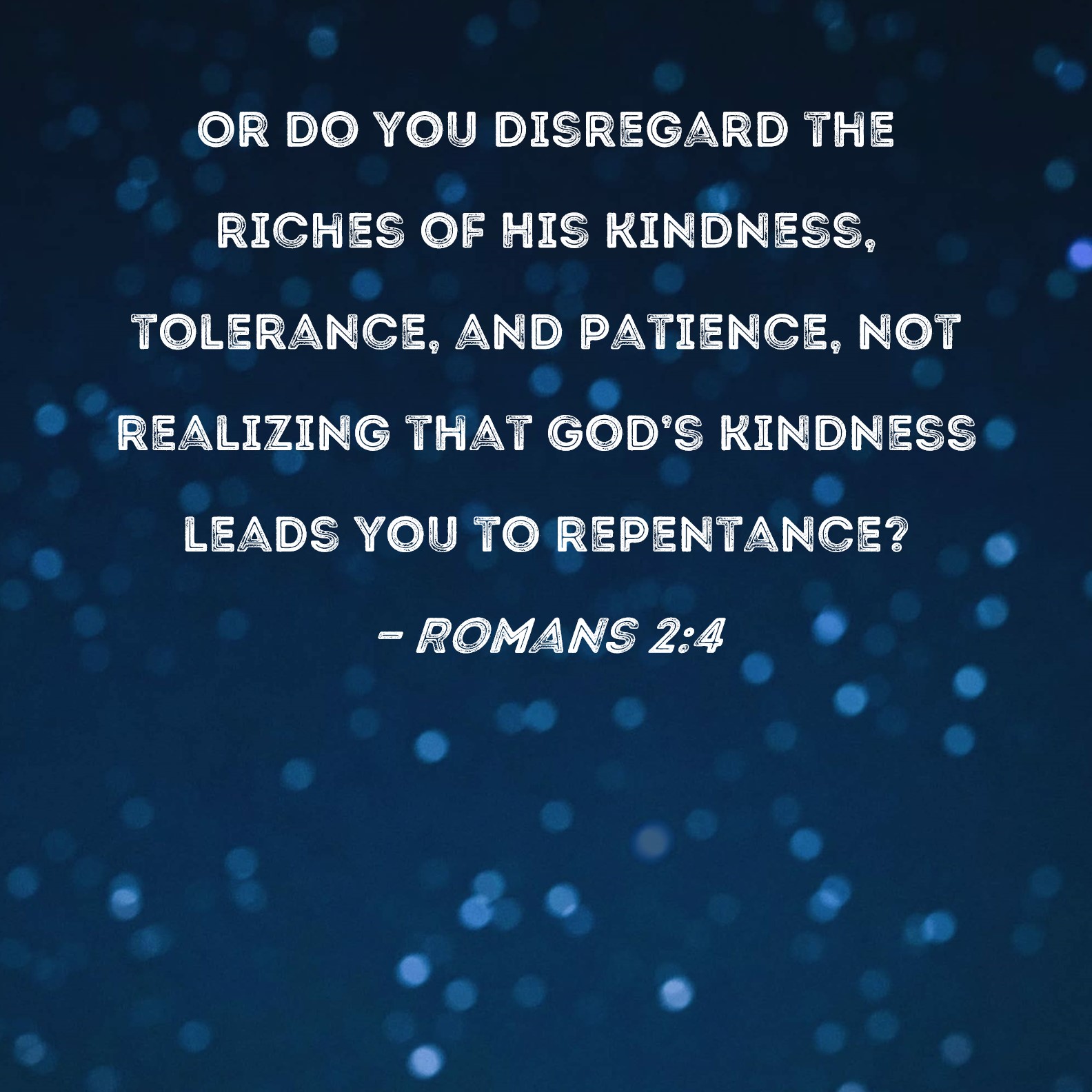 Romans 2:4 Or do you disregard the riches of His kindness, tolerance, and patience, not realizing that God's kindness leads you to repentance?