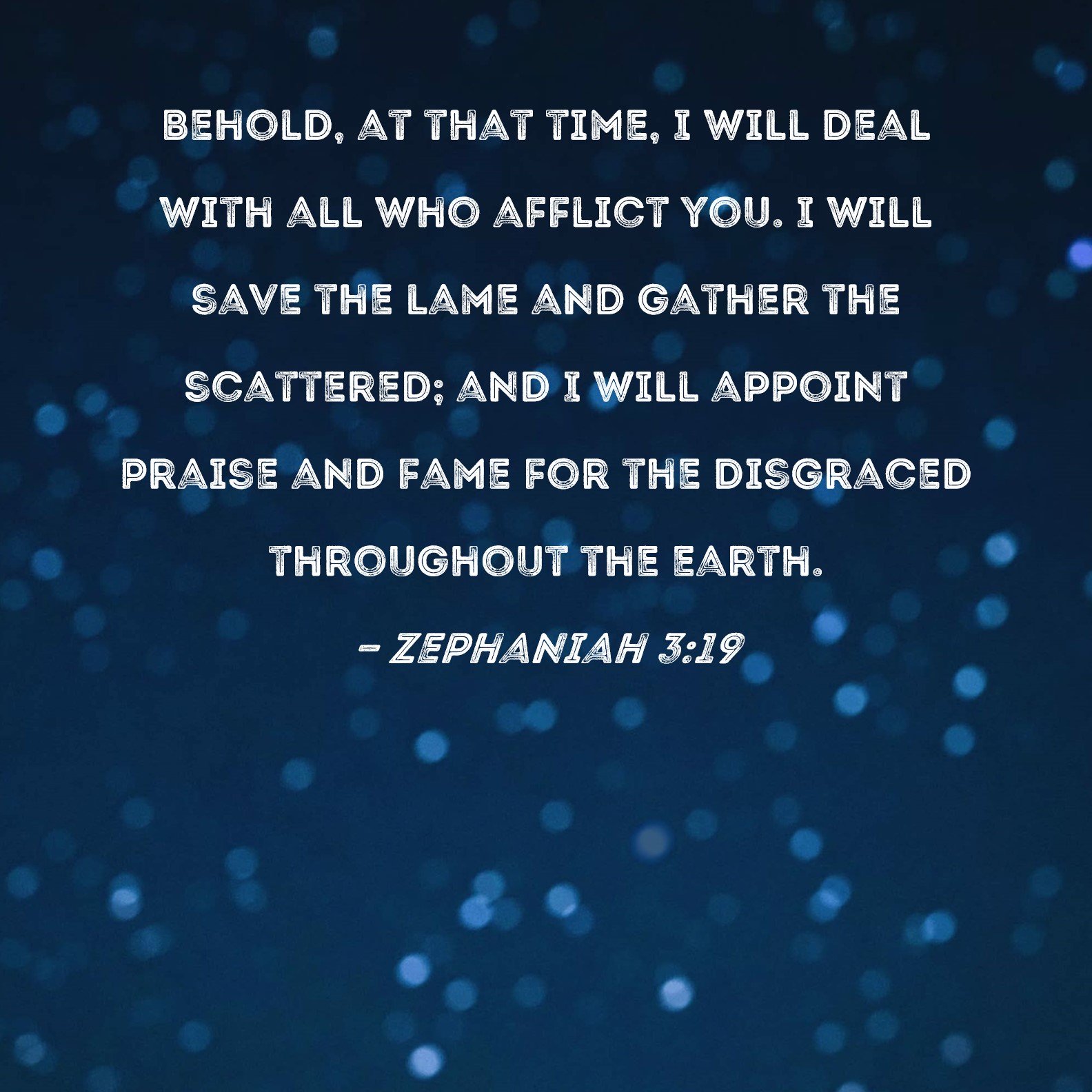 Zephaniah 3:19 Behold, at that time, I will deal with all who afflict you. I will save the lame and gather the scattered; and I will appoint praise and fame for the disgraced throughout the earth.