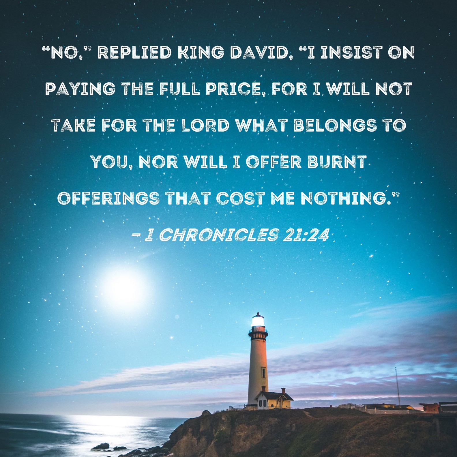 1 Chronicles 21:24 "No," replied King David, "I insist on paying the full price, for I will not take for the LORD what belongs to you, nor will I offer burnt offerings that cost me nothing."