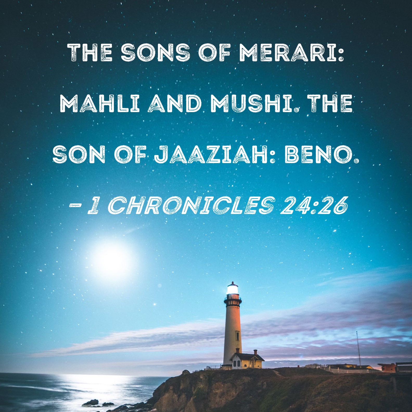 1 Chronicles 24:26 The sons of Merari: Mahli and Mushi. The son of Jaaziah: Beno.