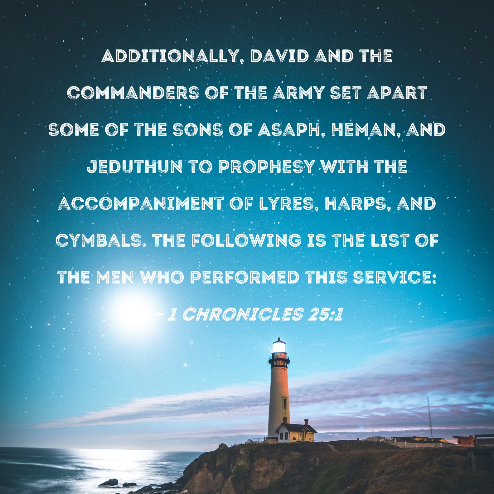 1 Chronicles 25:1 Additionally, David and the commanders of the army set apart some of the sons of Asaph, Heman, and Jeduthun to prophesy with the accompaniment of lyres, harps, and cymbals. The following is the list of the men who performed this service: