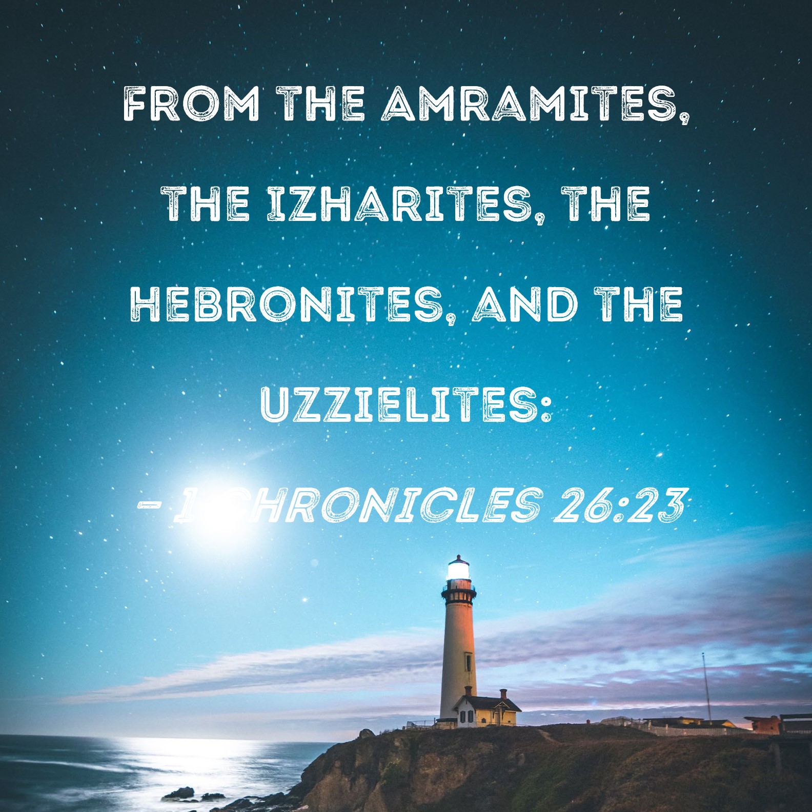 BSB: From the Amramites, the Izharites, the Hebronites, and the Uzzielites: KJV: Of the Amramites, and the Izharites, the Hebronites, and the Uzzielites: DRB: With the Amramites, and Isaarites, and Hebronites, and Ozielites. DBT: As to the Amramites, the Jizharites, the Hebronites, the Uzzielites.... ERV: Of the Amramites, of the Izharites, of the Hebronites, of the Uzzielites: WBT: Of the Amramites, and the Izharites, the Hebronites, and the Uzzielites: WEB: Of the Amramites, of the Izharites, of the Hebronites, of the Uzzielites: YLT: for the Amramite, for the Izharite, for the Hebronite, for the Uzzielite.Links 1 Chronicles 26:23 NIV • 1 Chronicles 26:23 NLT • 1 Chronicles 26:23 ESV • 1 Chronicles 26:23 NASB • 1 Chronicles 26:23 KJV • 1 Chronicles 26:23 Interlinear • 1 Chronicles 26:23 Commentaries • 1 Chronicles 26:23 Parallel Texts • 1 Chronicles 26:23 Bible Apps • 1 Chronicles 26:23 Parallel • Bible Hub |