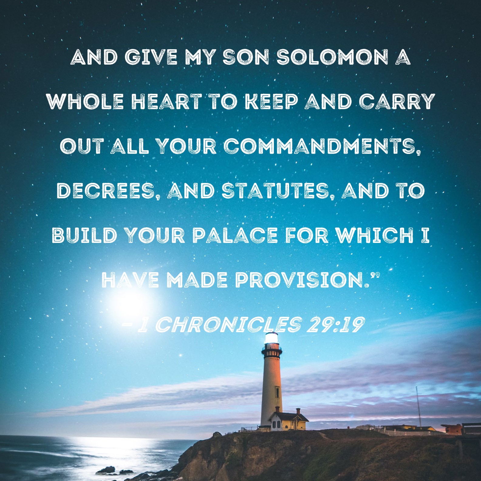 1 Chronicles 29:19 And give my son Solomon a whole heart to keep and carry out all Your commandments, decrees, and statutes, and to build Your palace for which I have made provision."