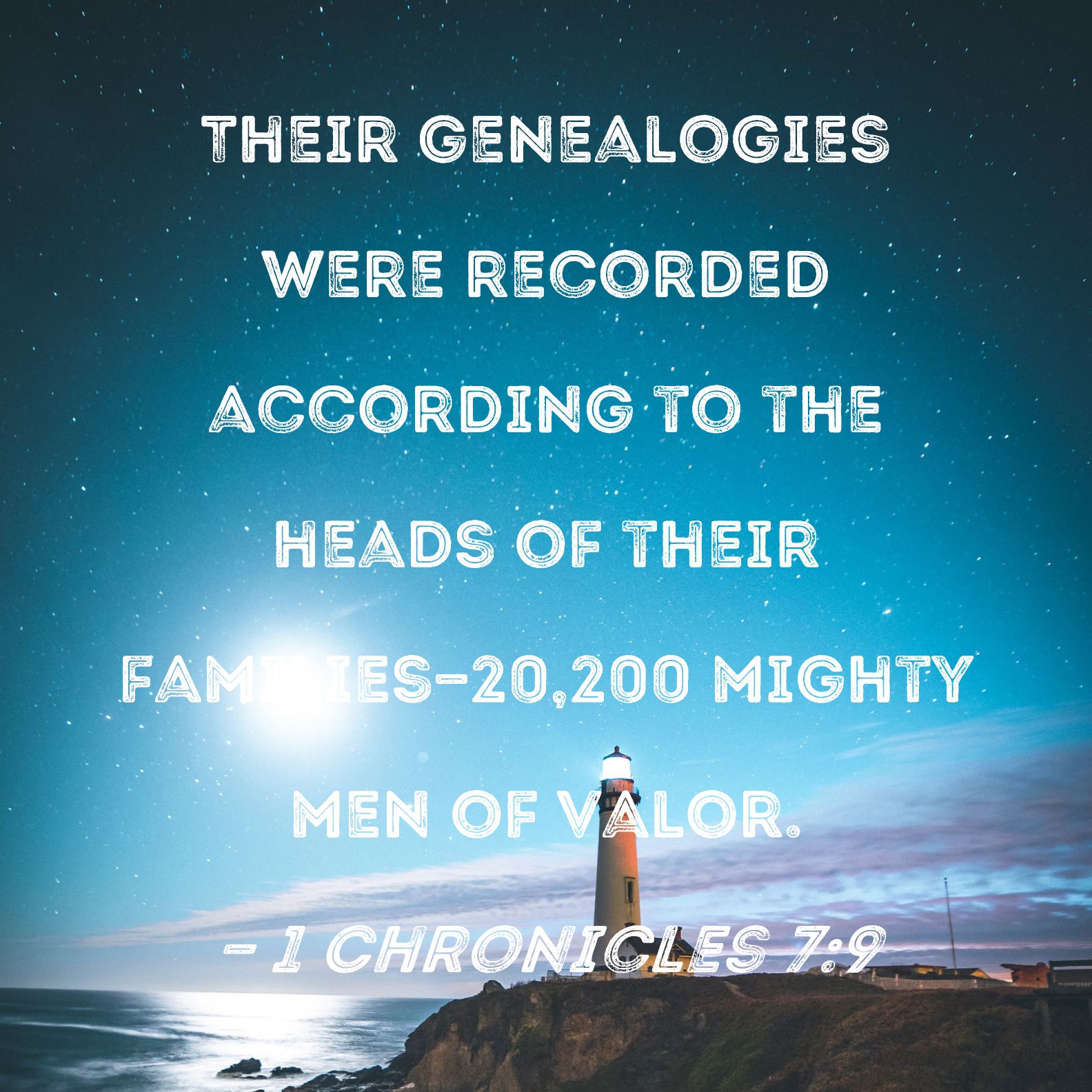 1 Chronicles 7:9 Their genealogies were recorded according to the heads of their families--20,200 mighty men of valor.