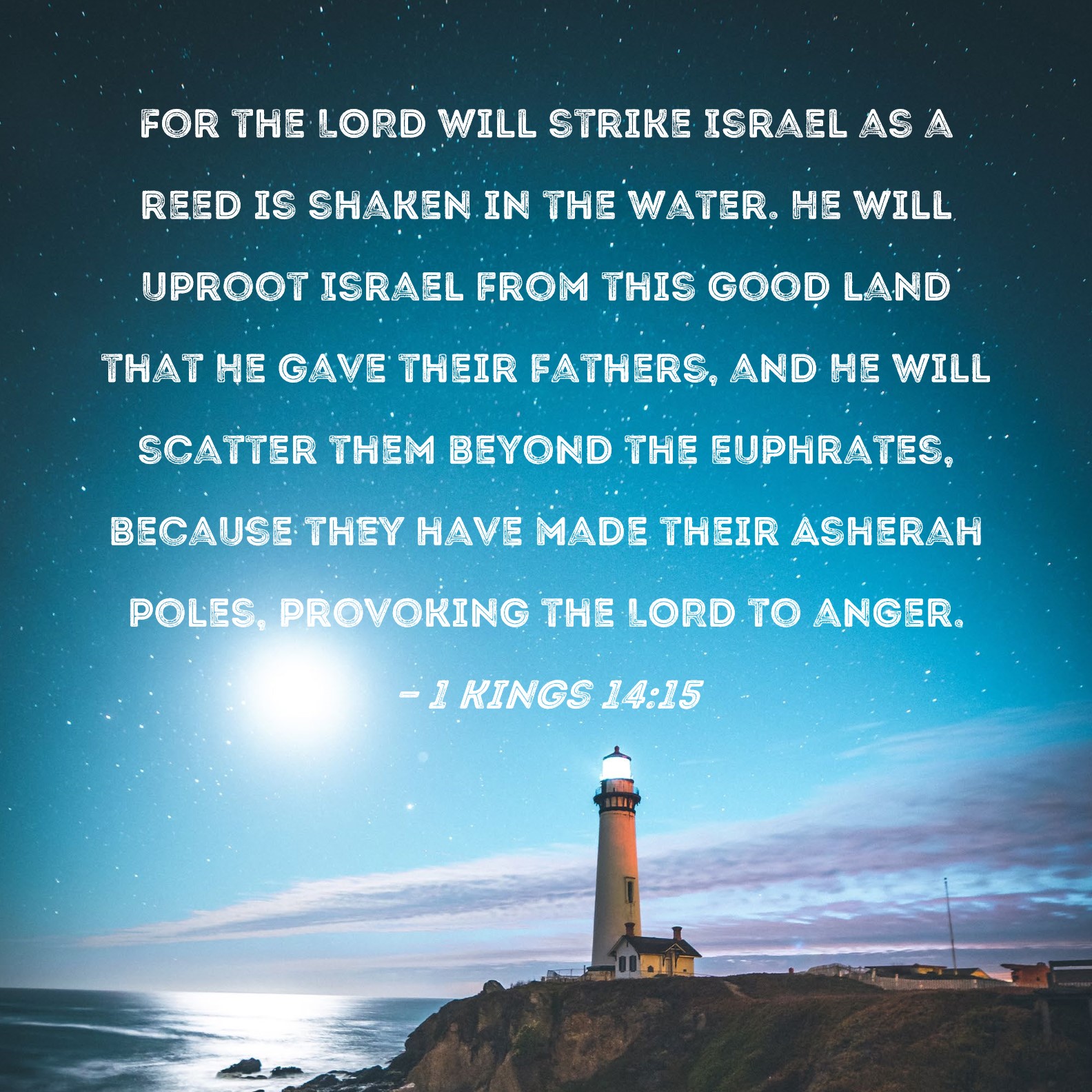 1 Kings 14:15 For the LORD will strike Israel as a reed is shaken in the water. He will uproot Israel from this good land that He gave their fathers, and He will scatter them beyond the Euphrates, because they have made their Asherah poles, provoking the LORD to anger.