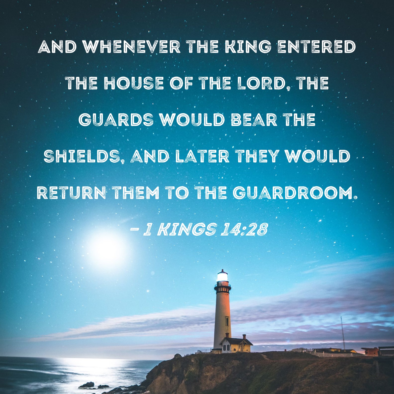 1 Kings 14:28 And whenever the king entered the house of the LORD, the guards would bear the shields, and later they would return them to the guardroom.