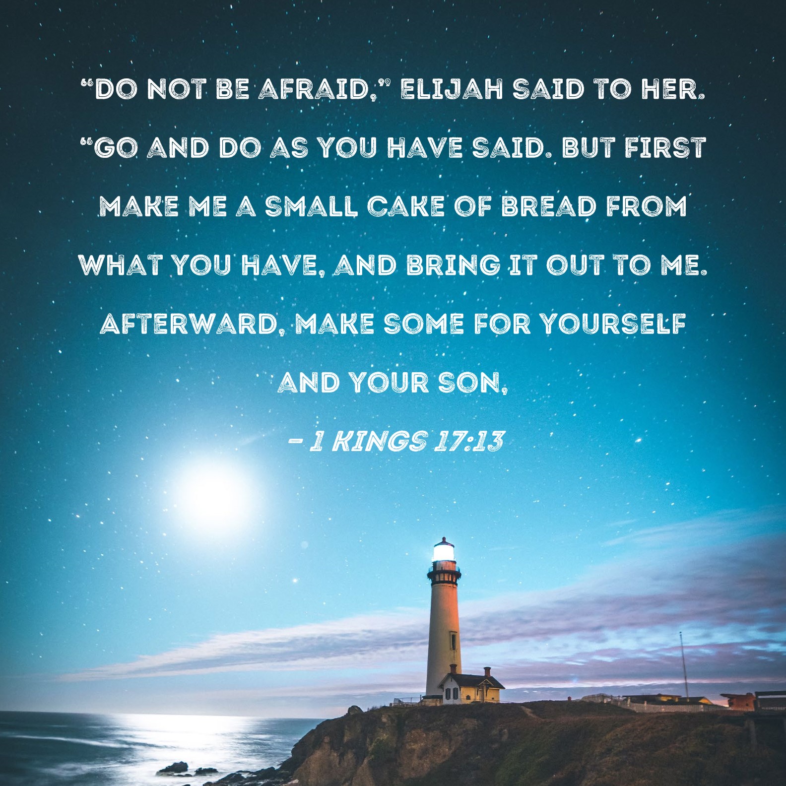 1 Kings 17:13 "Do not be afraid," Elijah said to her. "Go and do as you have said. But first make me a small cake of bread from what you have, and bring it out to me. Afterward, make some for yourself and your son,