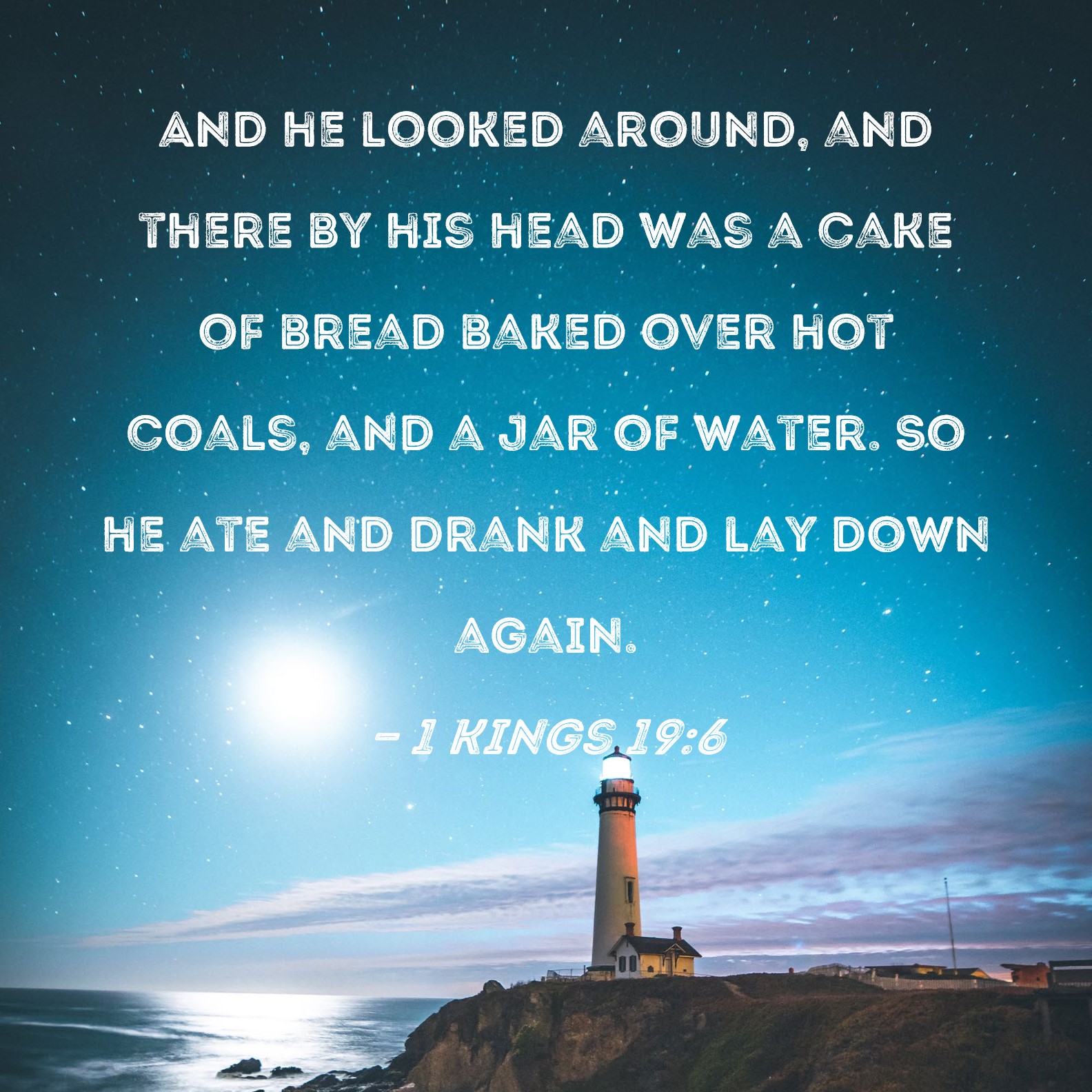 1 Kings 19:6 And he looked around, and there by his head was a cake of bread baked over hot coals, and a jar of water. So he ate and drank and lay down again.