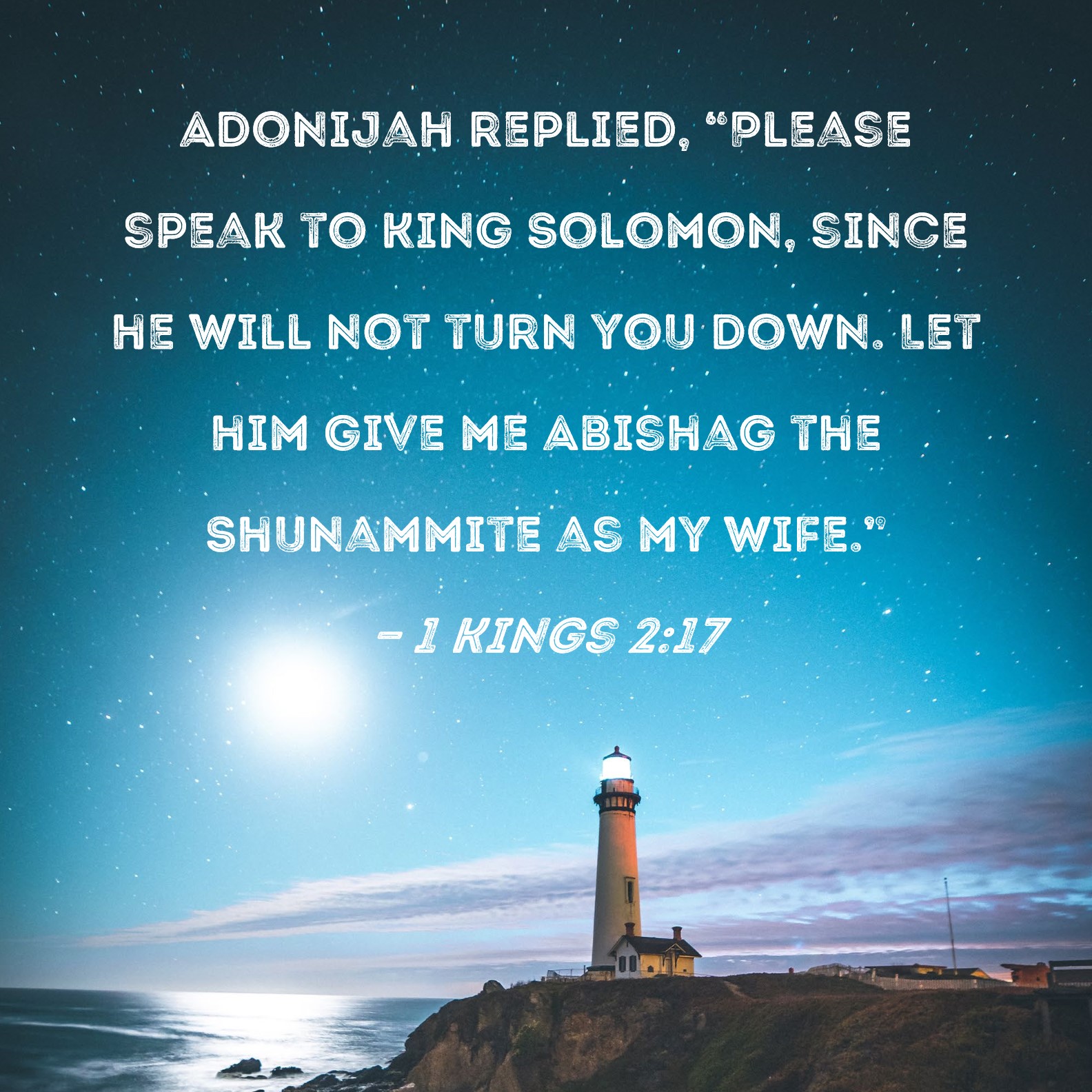 1 Kings 2:17 Adonijah replied, "Please speak to King Solomon, since he will not turn you down. Let him give me Abishag the Shunammite as my wife."