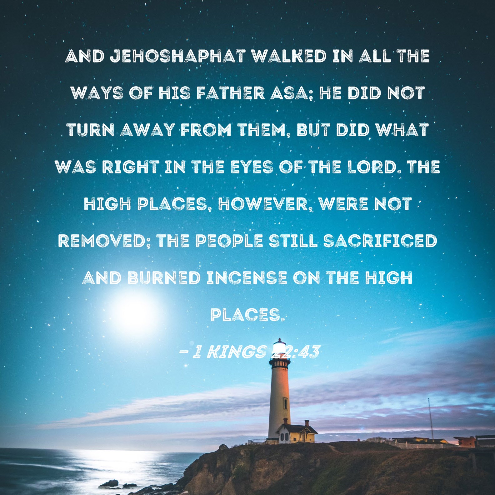 1 Kings 22:43 And Jehoshaphat walked in all the ways of his father Asa; he did not turn away from them, but did what was right in the eyes of the LORD. The high places, however, were not removed; the people still sacrificed and burned incense on the high places.