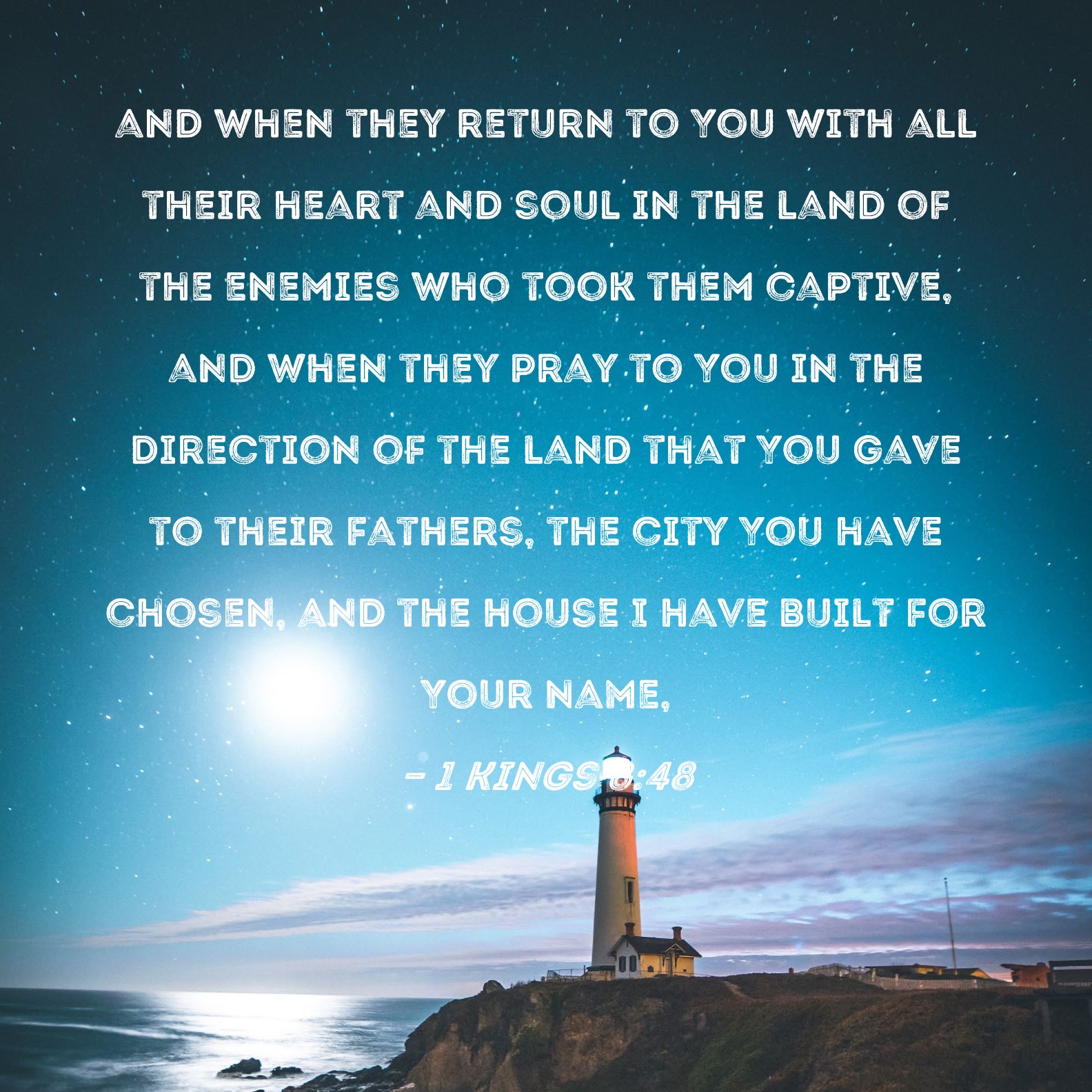 BSB: and when they return to You with all their heart and soul in the land of the enemies who took them captive, and when they pray to You in the direction of the land that You gave to their fathers, the city You have chosen, and the house I have built for Your Name, KJV: And so return unto thee with all their heart, and with all their soul, in the land of their enemies, which led them away captive, and pray unto thee toward their land, which thou gavest unto their fathers, the city which thou hast chosen, and the house which I have built for thy name: DRB: And return to thee with all their heart, and all their soul, in the land of their enemies, to which they had been led captives: and pray to thee towards the way of their land, which thou gavest to their fathers, and of the city which thou hast chosen, and of the temple which I have built to thy name: DBT: and if they return unto thee with all their heart and with all their soul, in the land of their enemies who led them away captive, and pray unto thee toward their land which thou gavest unto their fathers, the city that thou hast chosen, and the house that I have built unto thy name; ERV: if they return unto thee with all their heart and with all their soul in the land of their enemies, which carried them captive, and pray unto thee toward their land, which thou gavest unto their fathers, the city which thou hast chosen, and the house which I have built for thy name: WBT: And so return to thee with all their heart, and with all their soul, in the land of their enemies, who led them away captive, and pray to thee towards their land, which thou gavest to their fathers, the city which thou hast chosen, and the house which I have built for thy name: WEB: if they return to you with all their heart and with all their soul in the land of their enemies who carried them captive, and pray to you toward their land which you gave to their fathers, the city which you have chosen and the house which I have built for your name, YLT: yea, they have turned back unto Thee, with all their heart, and with all their soul, in the land of their enemies who have taken them captive, and have prayed unto Thee the way of their land, which Thou gavest to their fathers, the city which Thou hast chosen, and the house which I have builded for Thy name:Links 1 Kings 8:48 NIV • 1 Kings 8:48 NLT • 1 Kings 8:48 ESV • 1 Kings 8:48 NASB • 1 Kings 8:48 KJV • 1 Kings 8:48 Interlinear • 1 Kings 8:48 Commentaries • 1 Kings 8:48 Parallel Texts • 1 Kings 8:48 Bible Apps • 1 Kings 8:48 Parallel • Bible Hub |