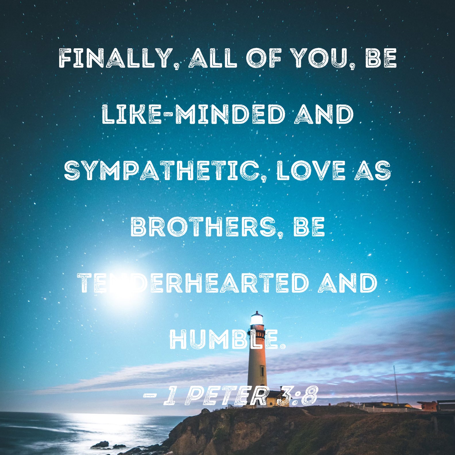 1 Peter 3:8 Finally, all of you, be like-minded and sympathetic, love as brothers, be tenderhearted and humble.