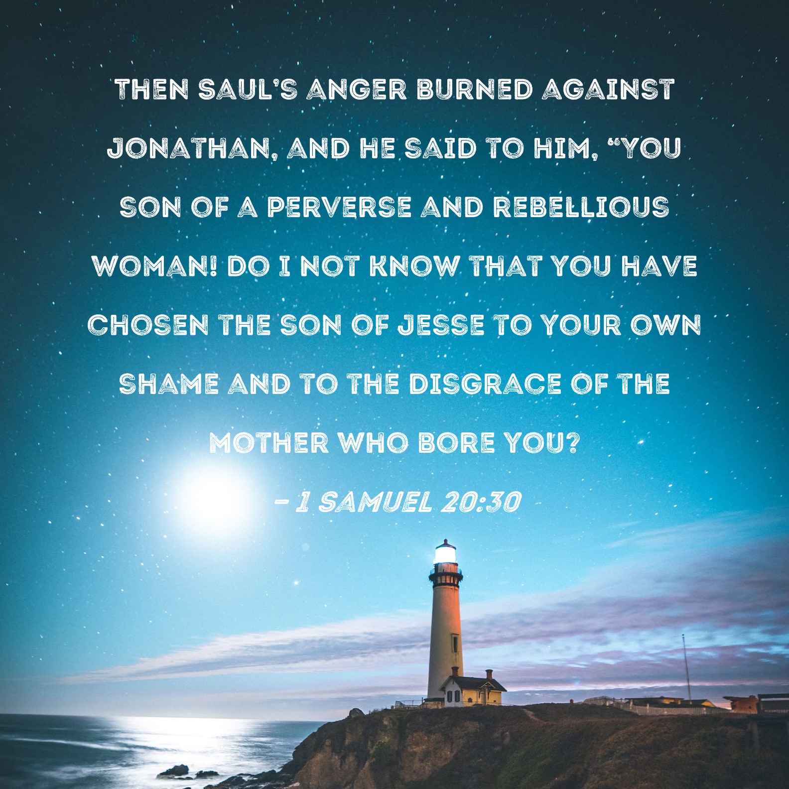1 Samuel 20:30 Then Saul's anger burned against Jonathan, and he said to him, "You son of a perverse and rebellious woman! Do I not know that you have chosen the son of Jesse to your own shame and to the disgrace of the mother who bore you?