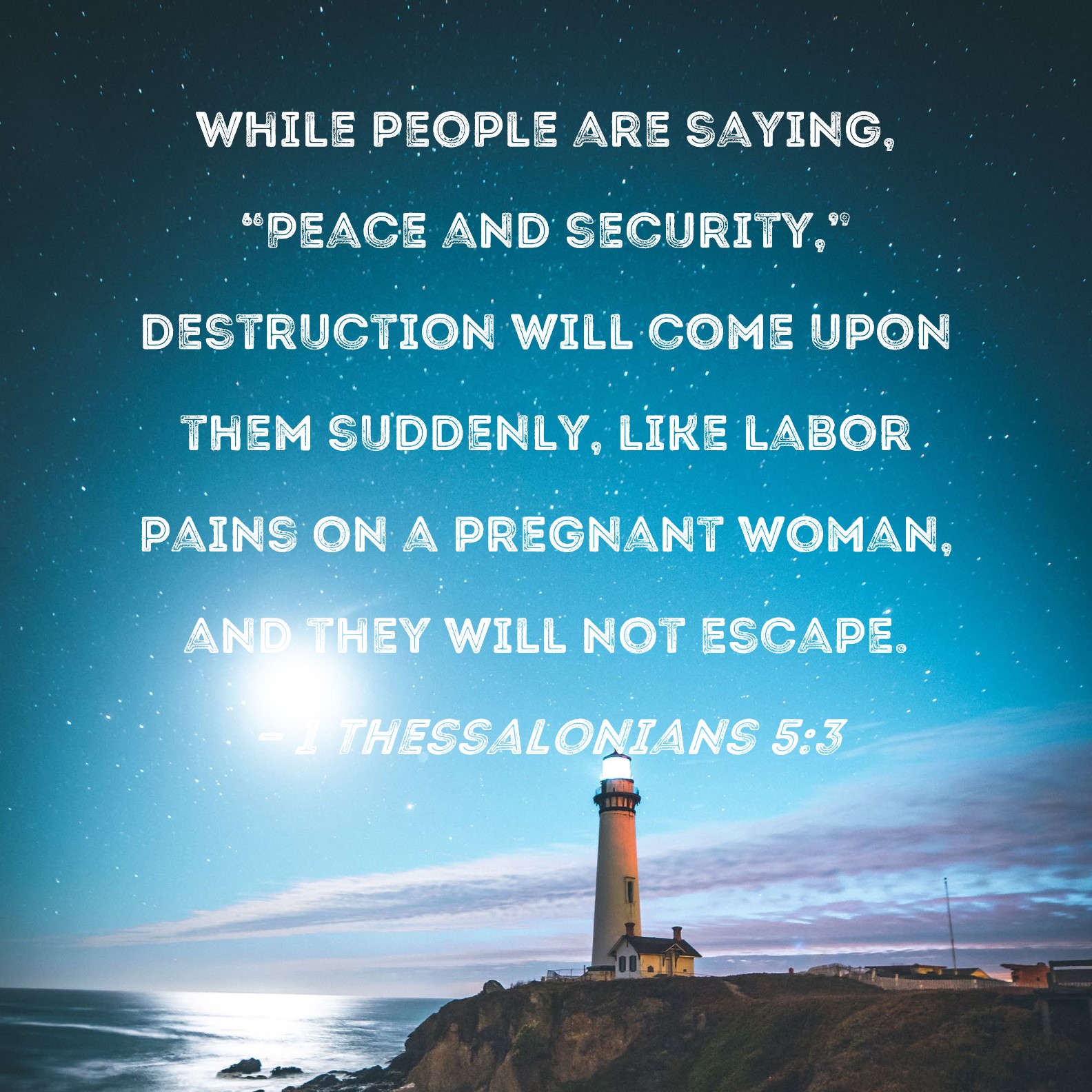 1 Thessalonians 5:3 While people are saying, "Peace and security," destruction will come upon them suddenly, like labor pains on a pregnant woman, and they will not escape.