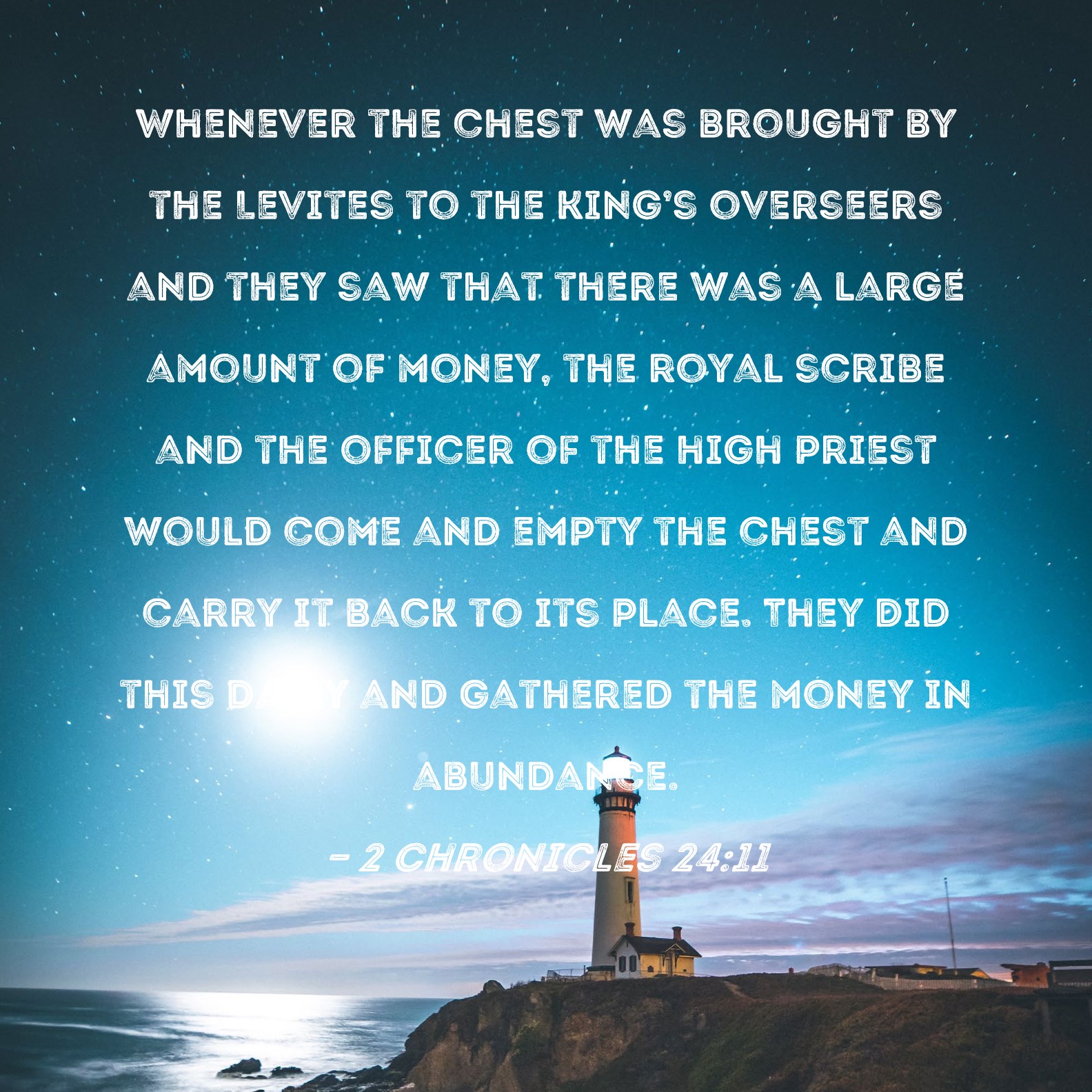 2 Chronicles 24:11 Whenever the chest was brought by the Levites to the king's overseers and they saw that there was a large amount of money, the royal scribe and the officer of the high priest would come and empty the chest and carry it back to its place. They did this daily and gathered the money in abundance.