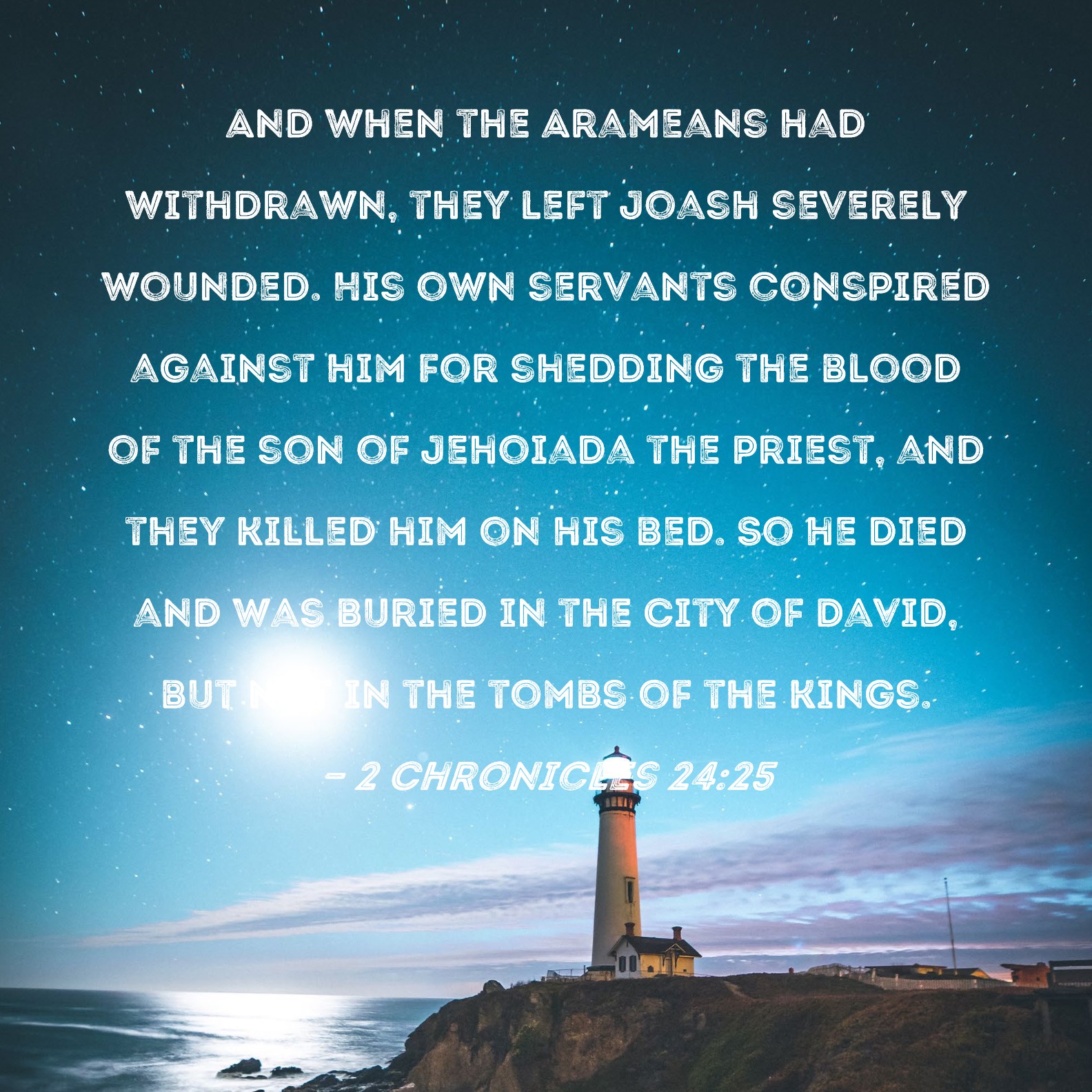 And when the Arameans had withdrawn, they left Joash severely wounded. His own servants conspired against him for shedding the blood of the son of Jehoiada the priest, and they killed him on his bed. So he died and was buried in the City of David, but not in the tombs of the kings.