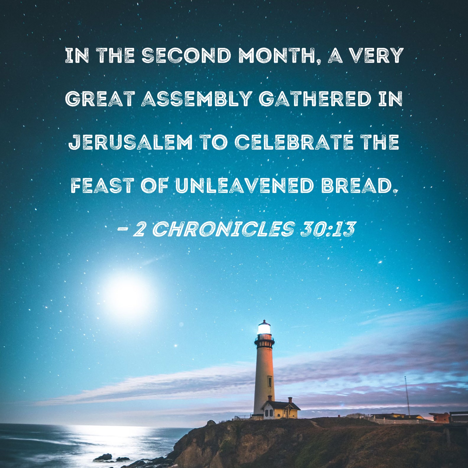 2 Chronicles 30:13 In the second month, a very great assembly gathered in Jerusalem to celebrate the Feast of Unleavened Bread.