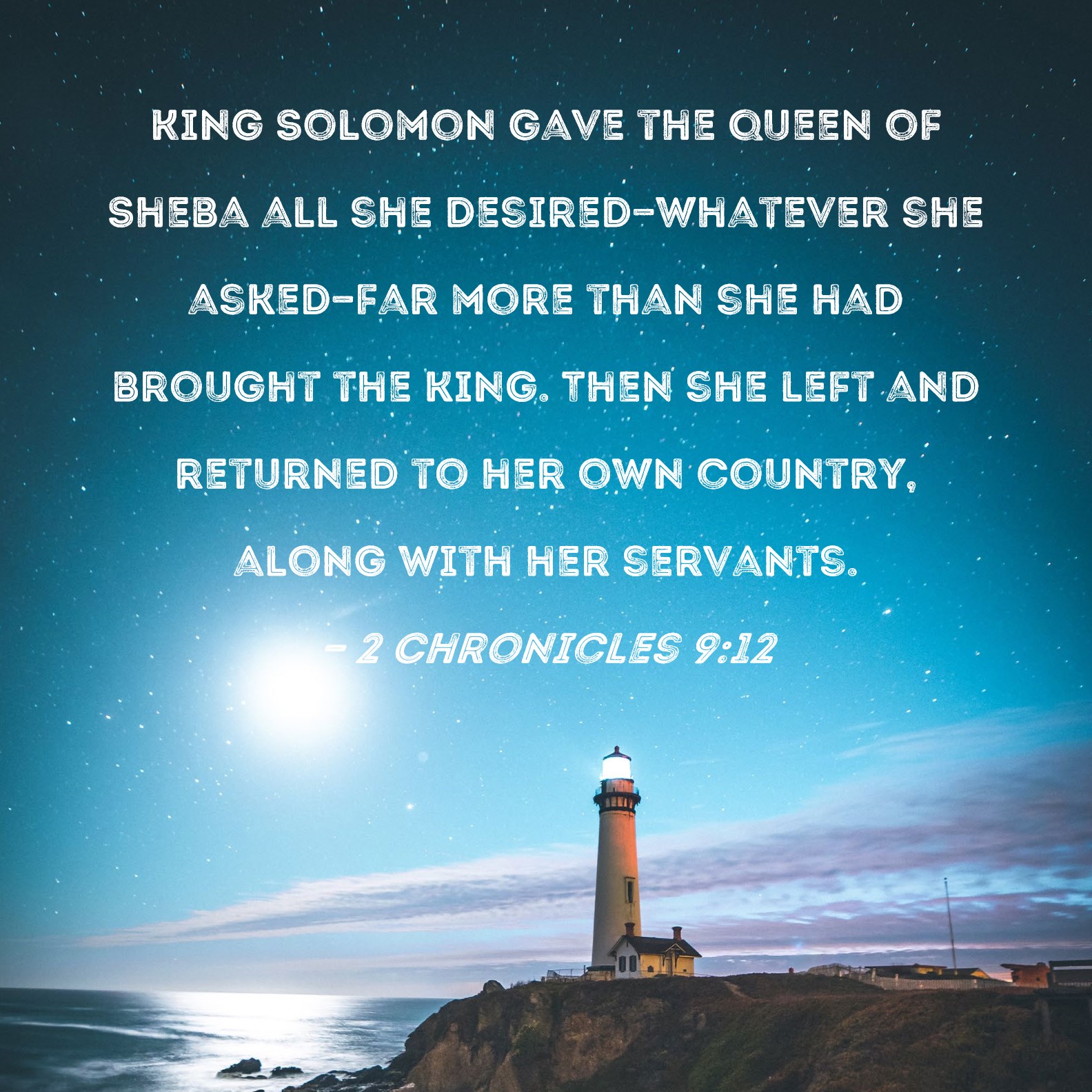 2 Chronicles 9:12 King Solomon gave the queen of Sheba all she desired--whatever she asked--far more than she had brought the king. Then she left and returned to her own country, along with her servants.
