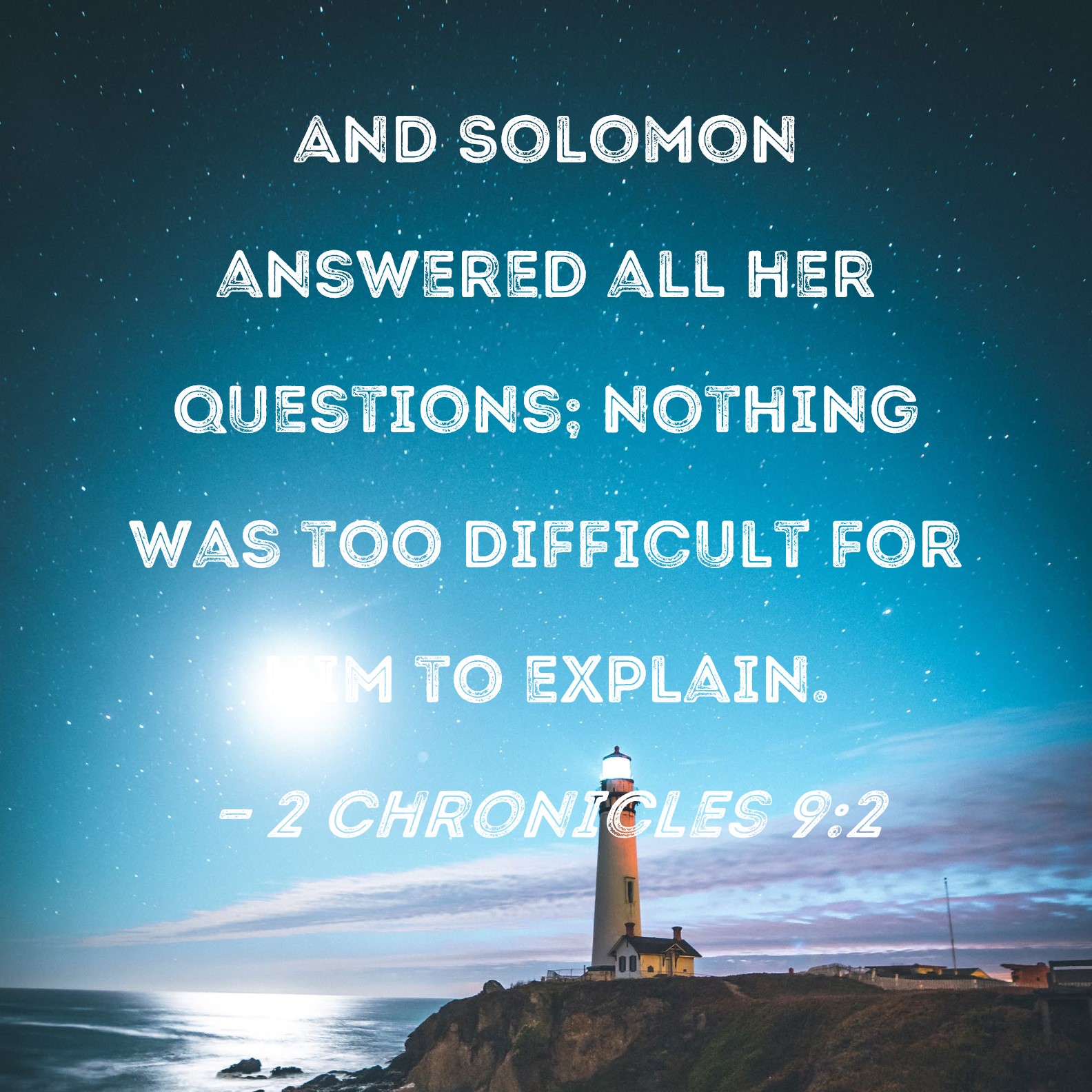 2 Chronicles 9:2 And Solomon answered all her questions; nothing was too difficult for him to explain.