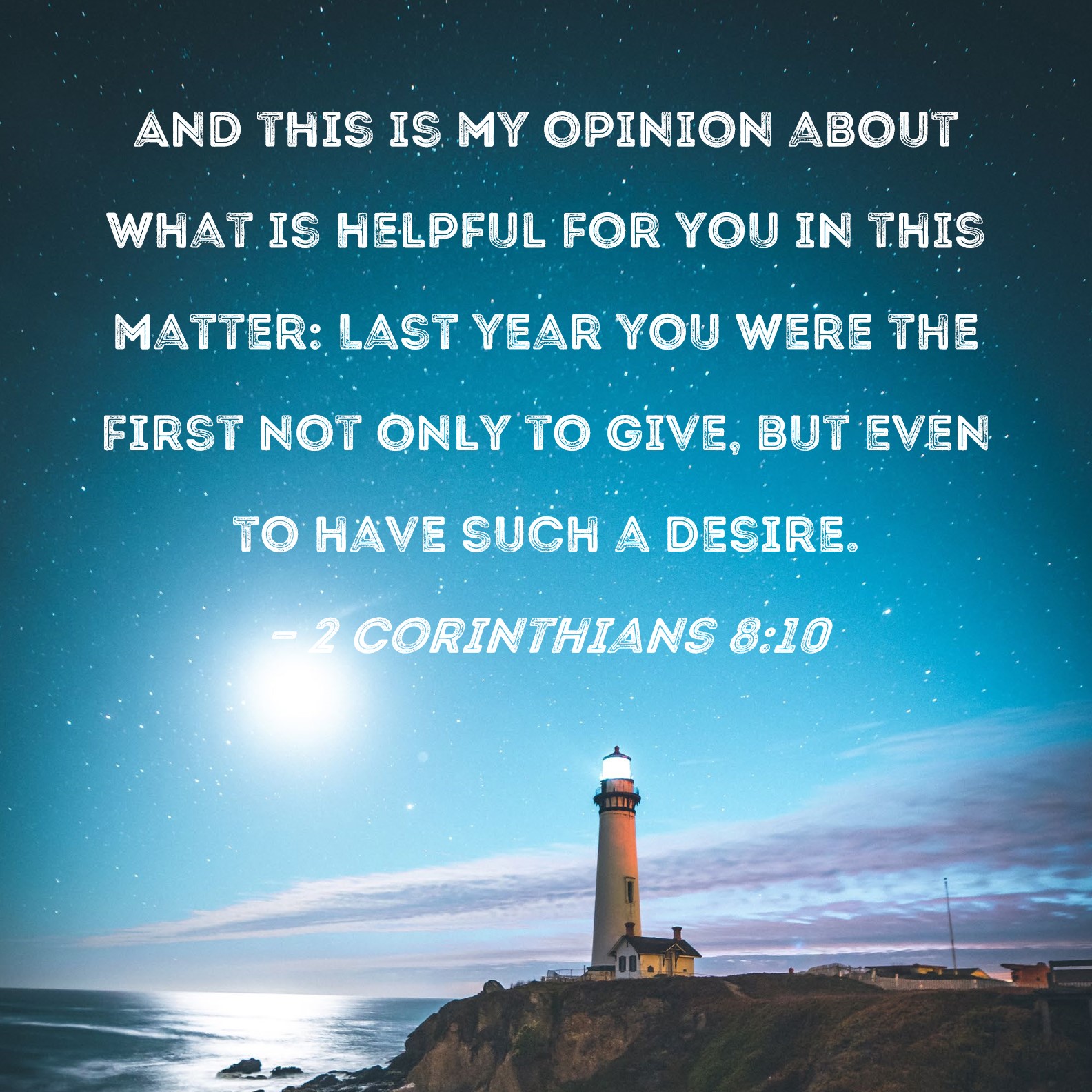 2 Corinthians 8:10 And this is my opinion about what is helpful for you in this matter: Last year you were the first not only to give, but even to have such a desire.