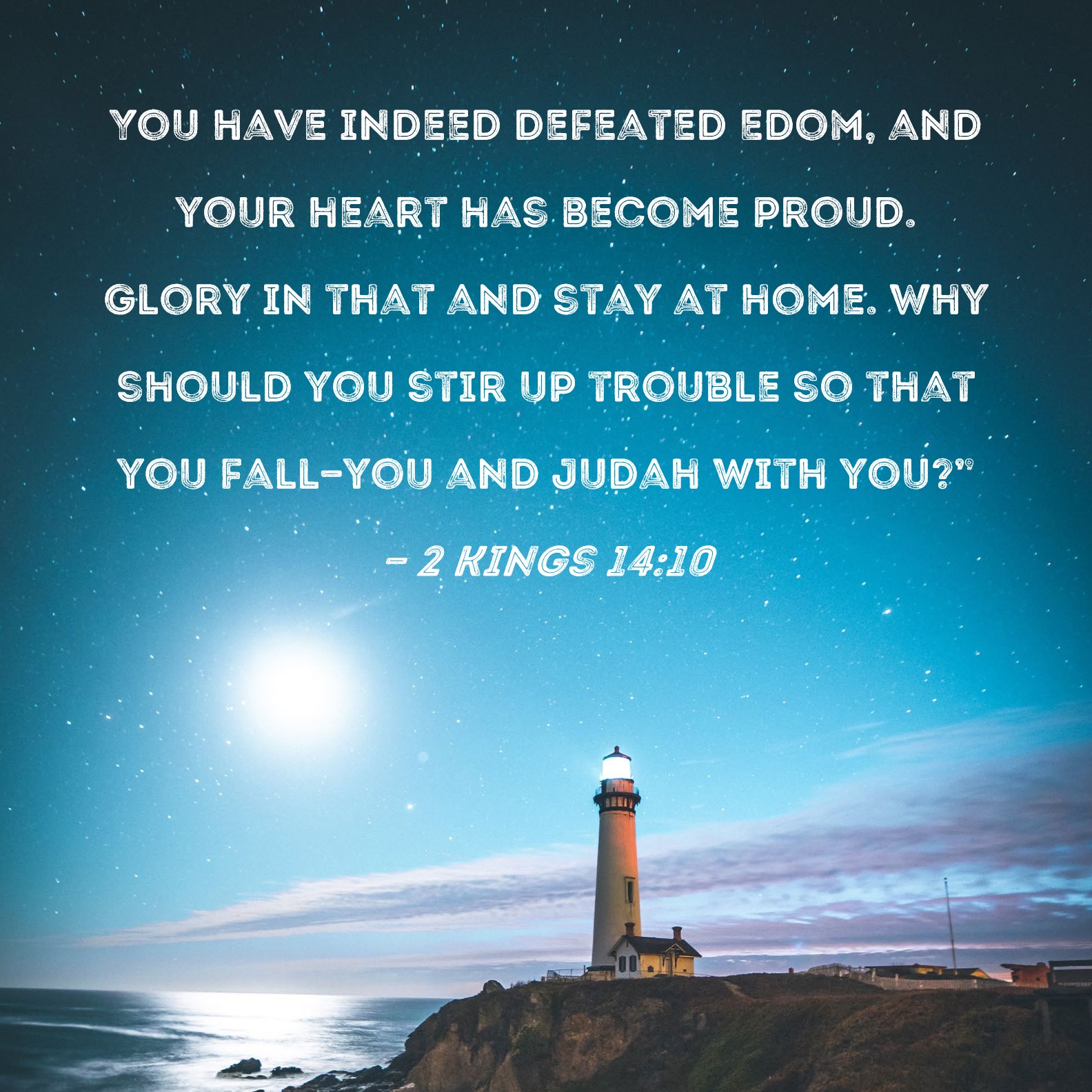 2 Kings 14:10 You have indeed defeated Edom, and your heart has become proud. Glory in that and stay at home. Why should you stir up trouble so that you fall--you and Judah with you?"