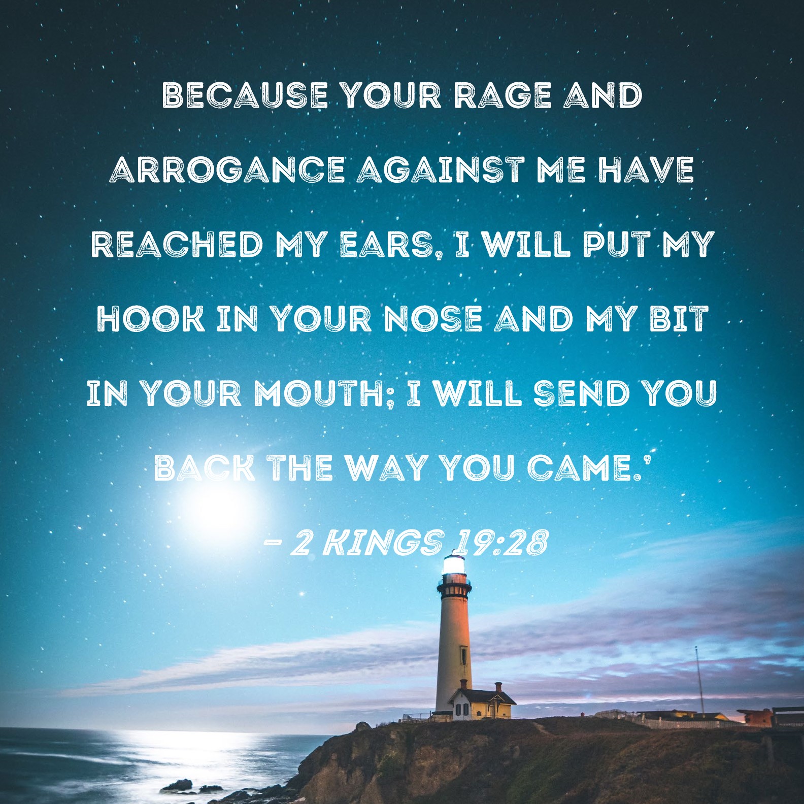 2 Kings 19:28 Because your rage and arrogance against Me have reached My ears, I will put My hook in your nose and My bit in your mouth; I will send you back the way you came.'